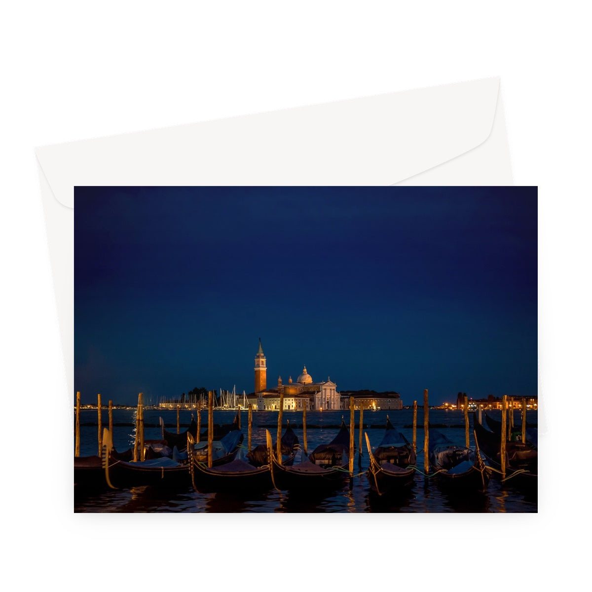 Gondolas moored in St Mark's Basin with San Giorgio Maggiore in the background at night, Venice, Italy. Greeting Card