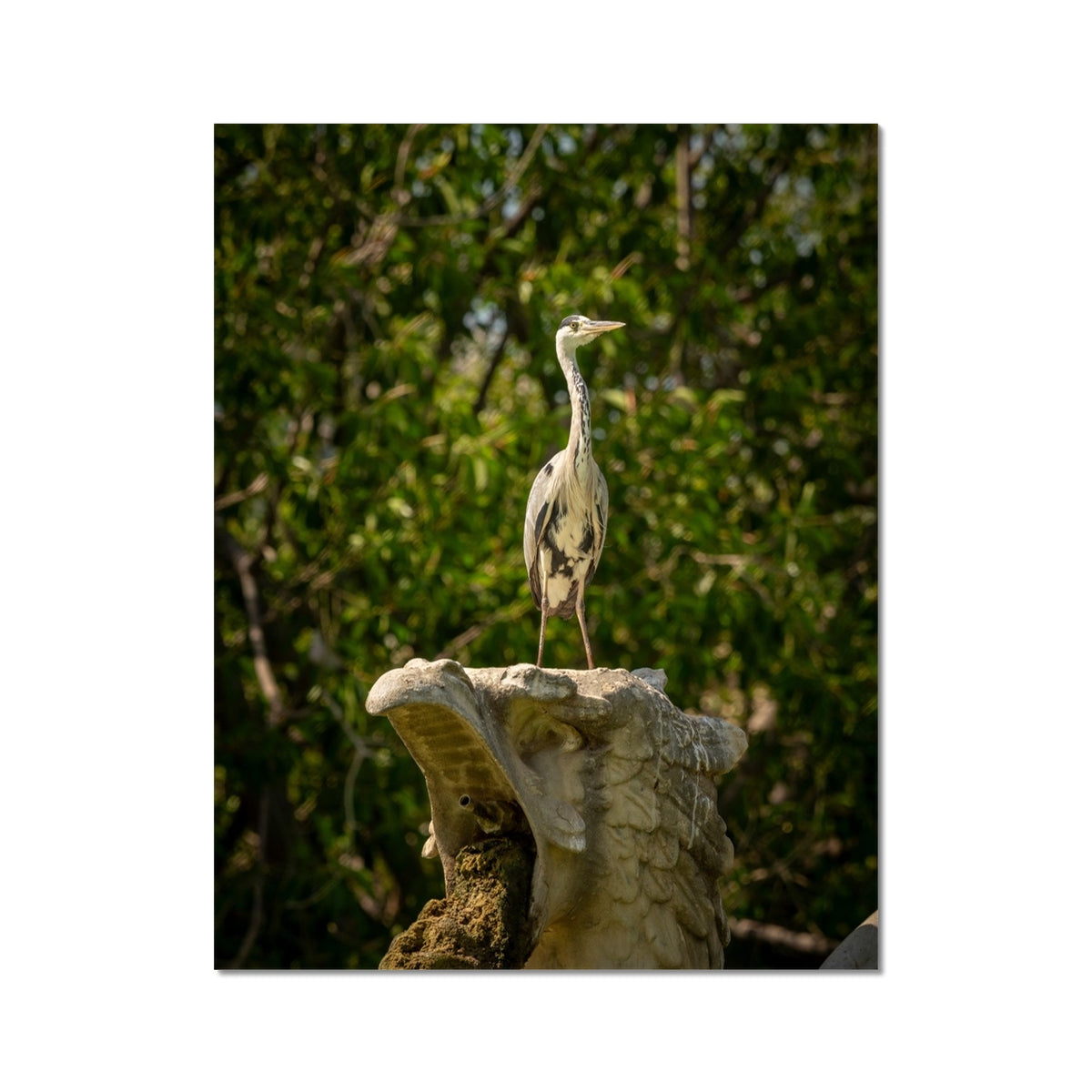 Grey heron perched on a stone fountain sculpture Fine Art Print