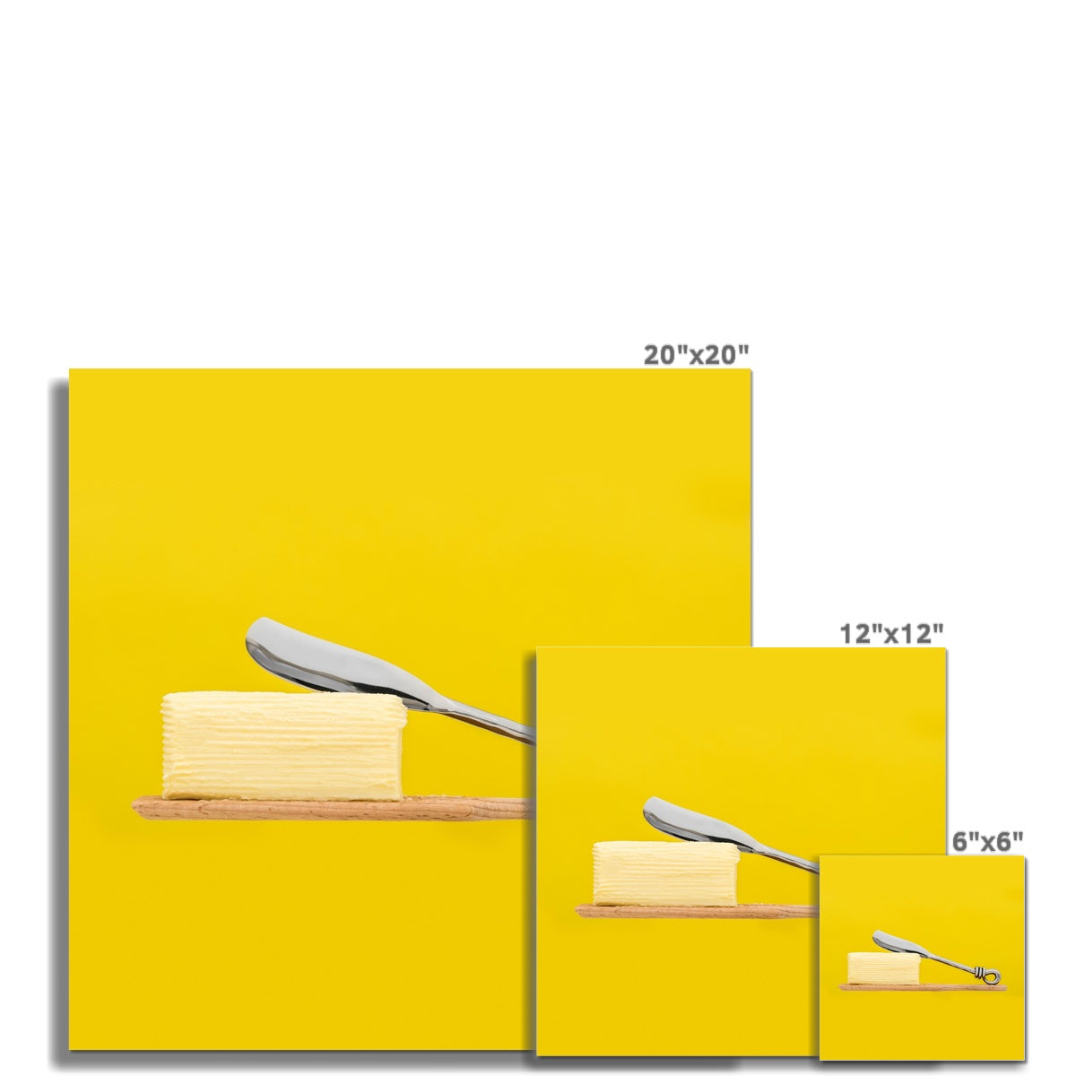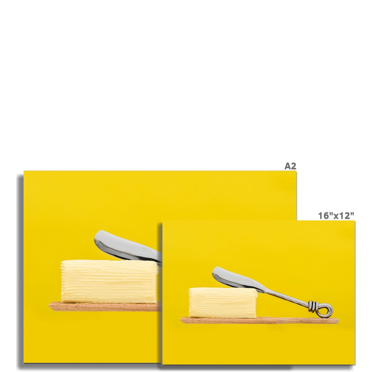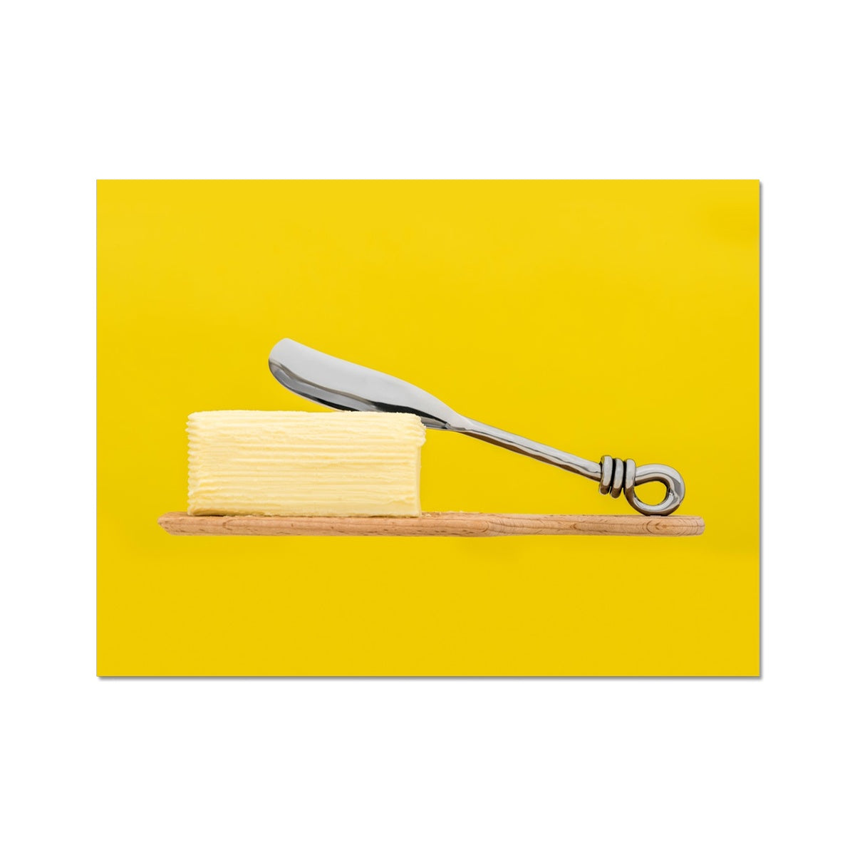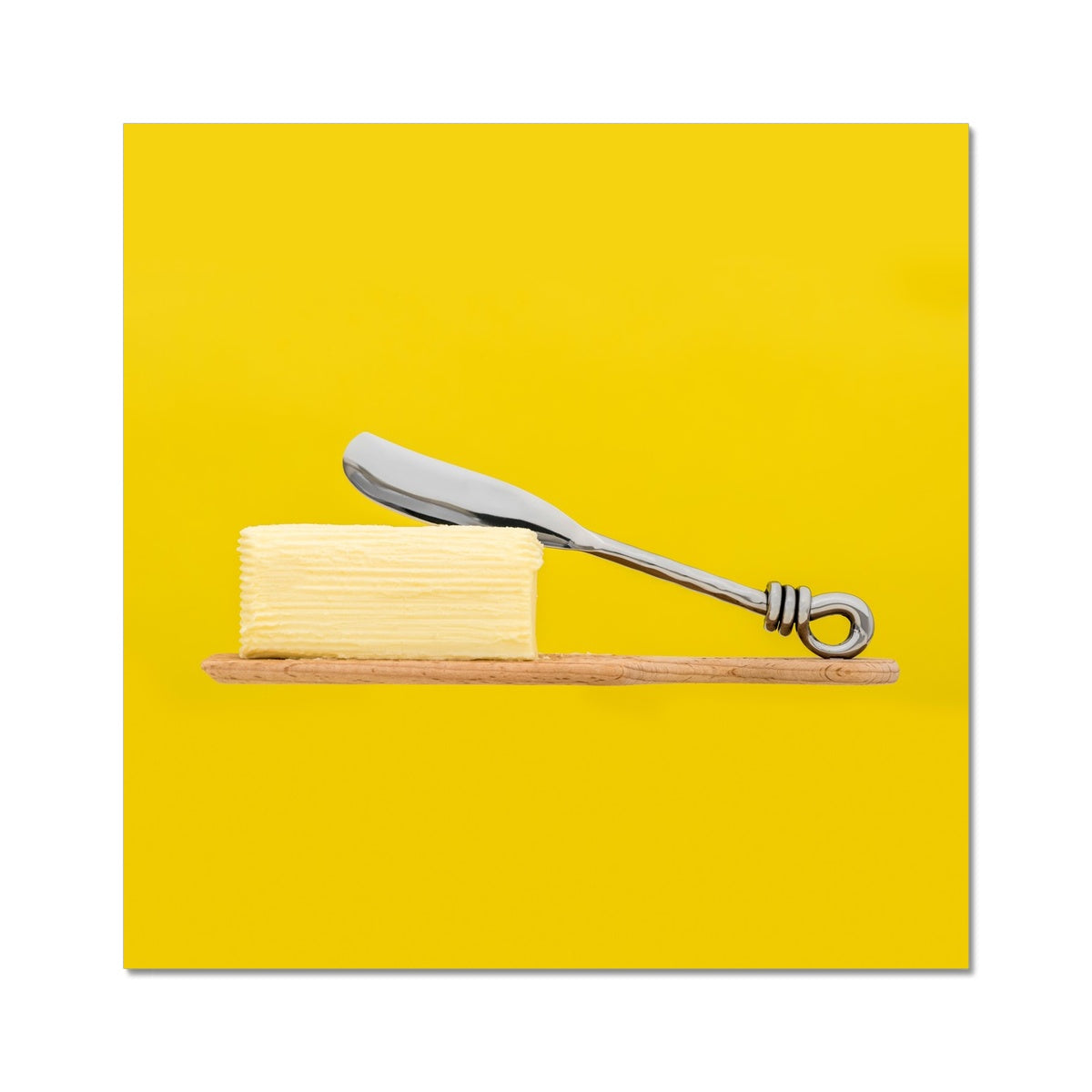 Homemade butter on wooden paddle with butter knife and yellow background. Fine Art Print