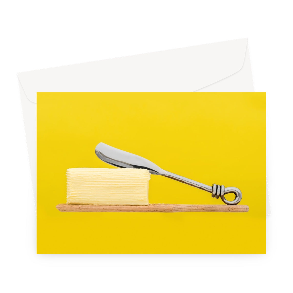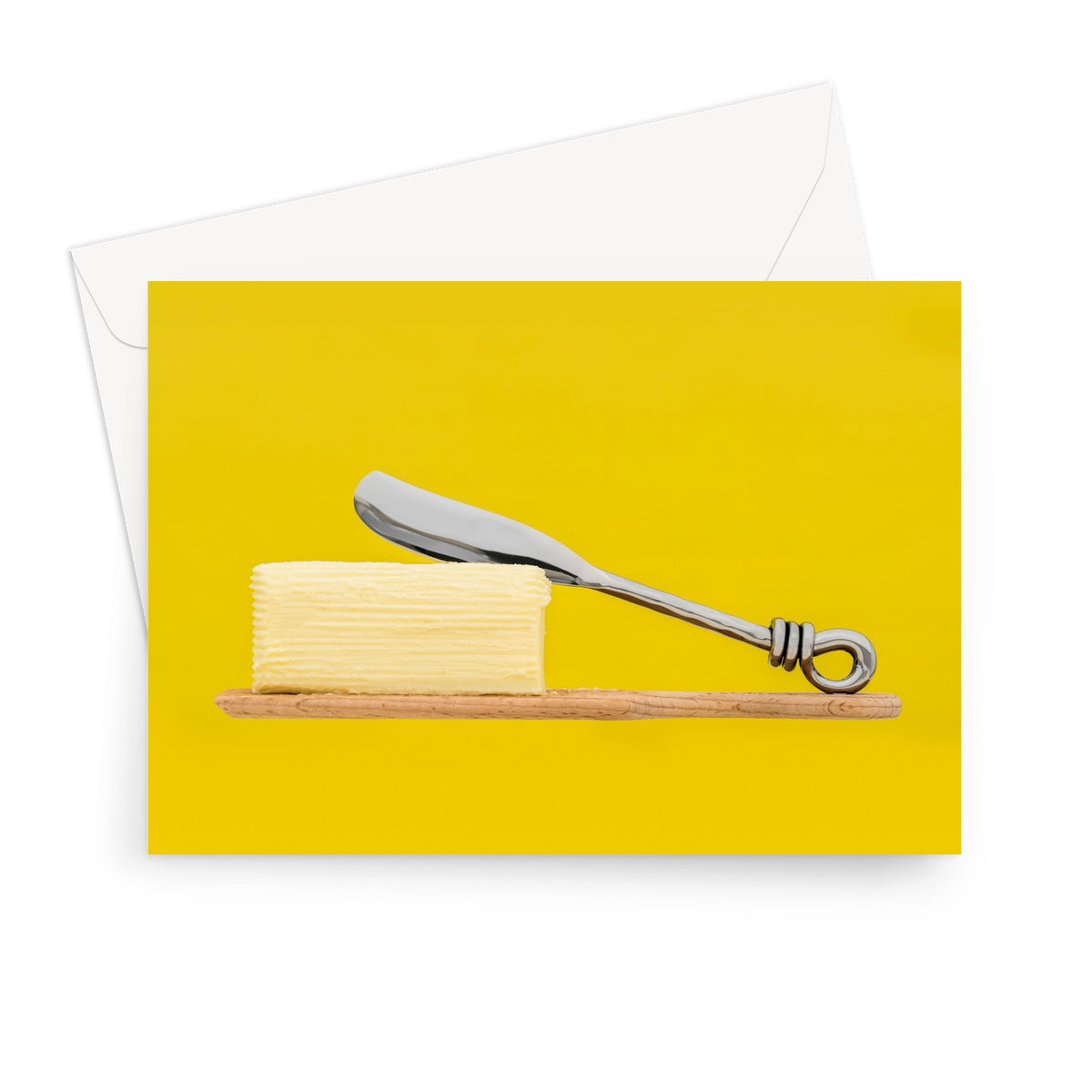 Homemade butter on wooden paddle with butter knife and yellow background. Greeting Card