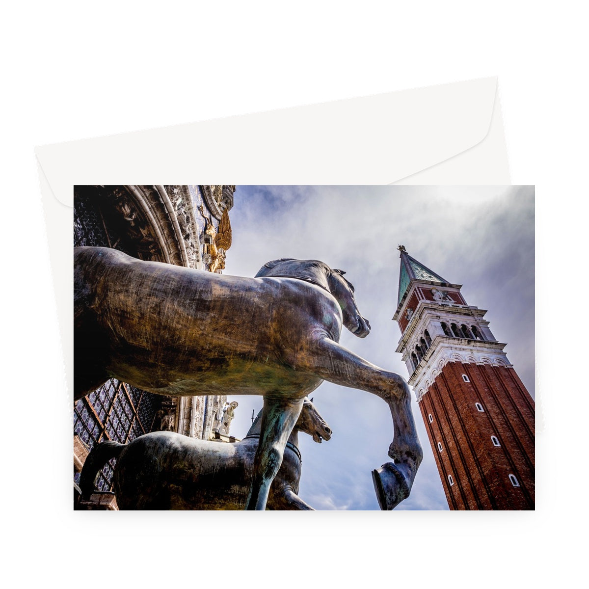 Horses of Saint Mark statues on the balcony of St Marks's basilica in Venice, Italy. Greeting Card