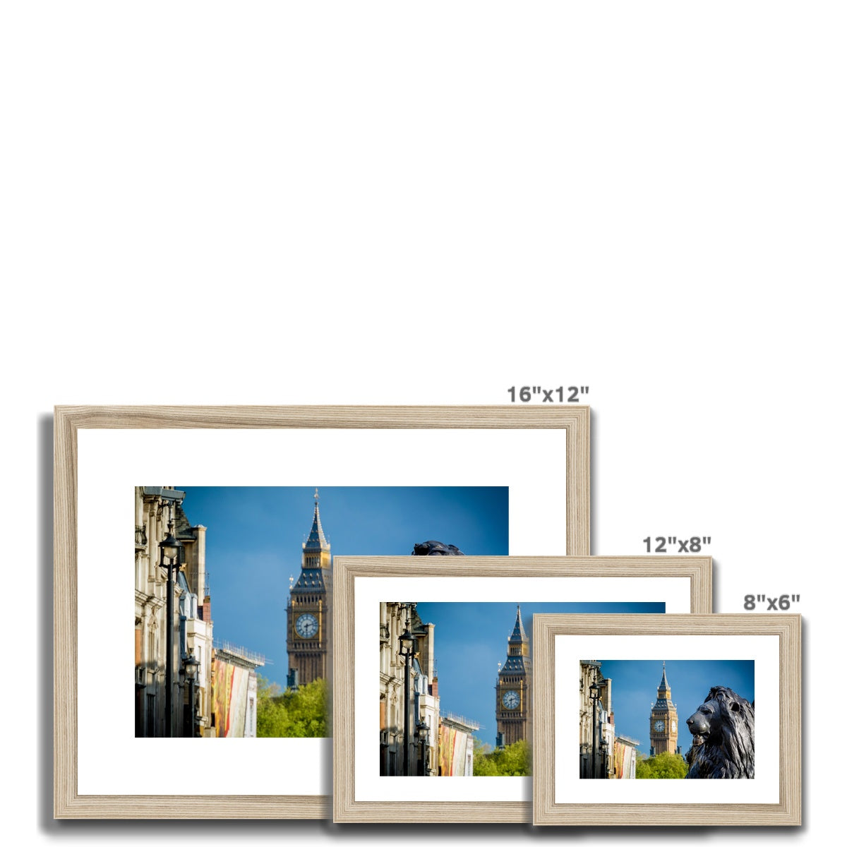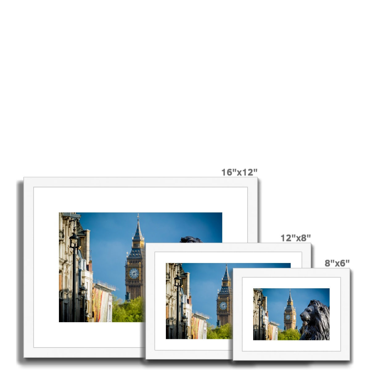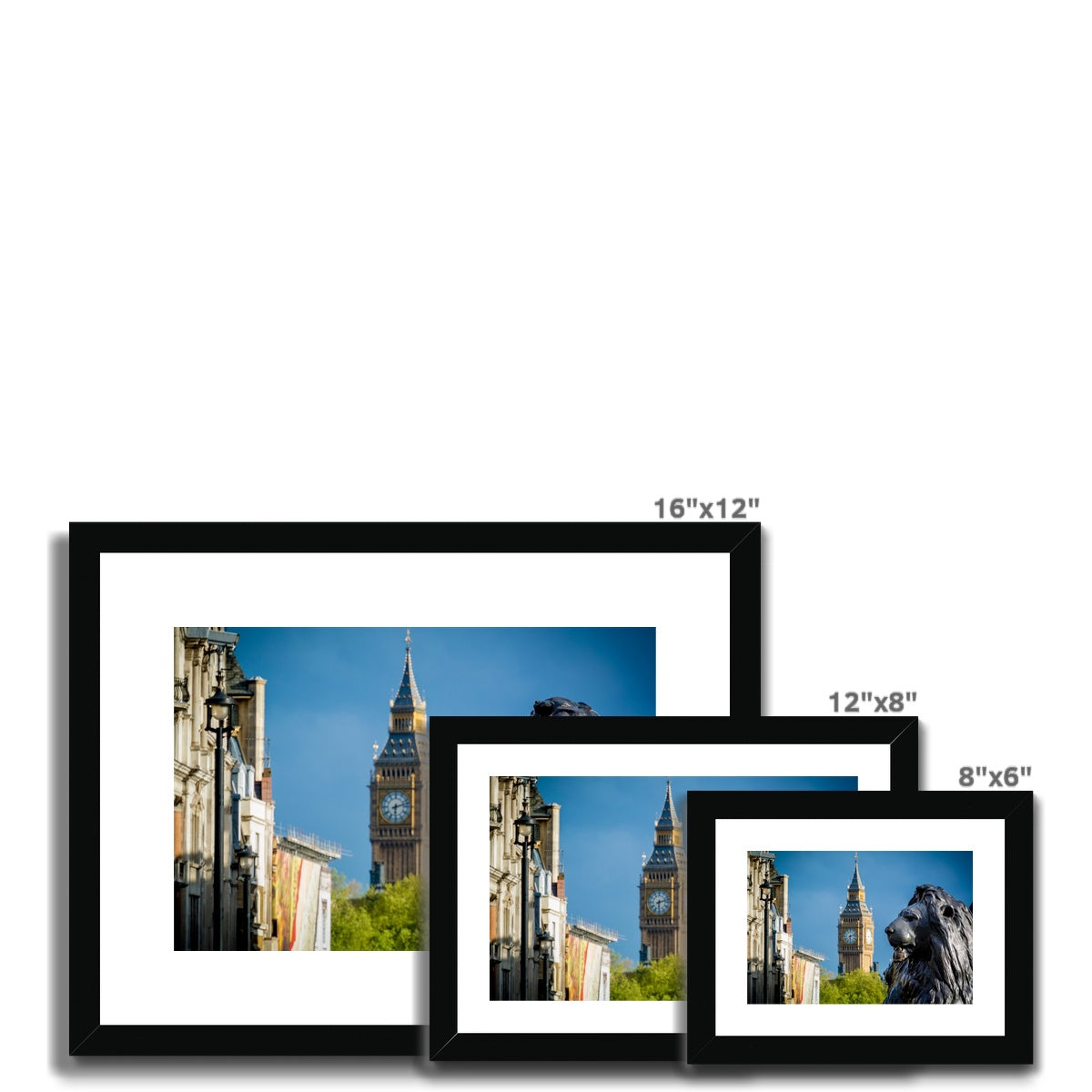 Lion statue in Trafalgar Square, with Big ben in background, London. Framed & Mounted Print