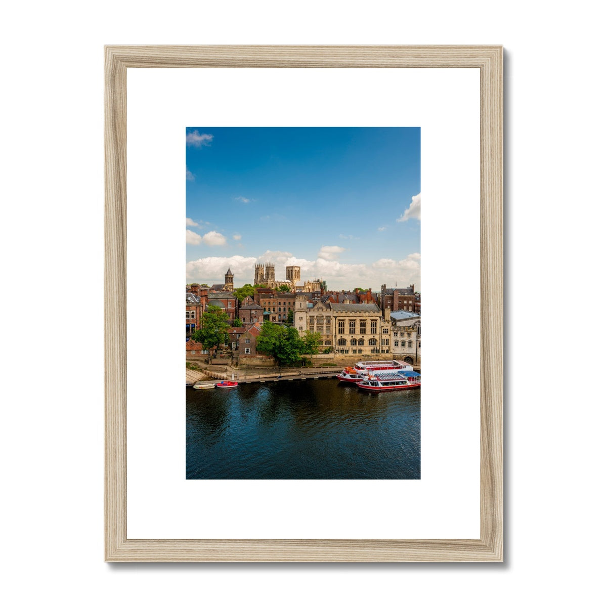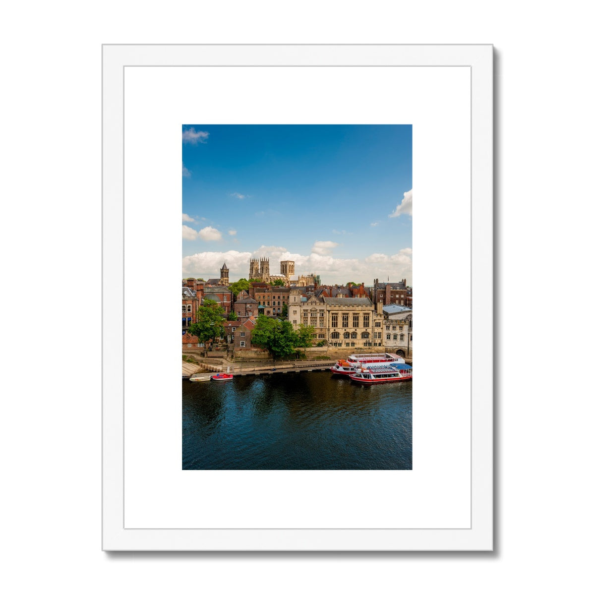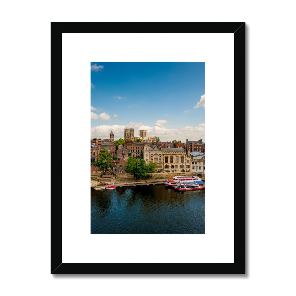 Moored boats on the River Ouse with the Guildhall and York Minster in the distance. York. UK Framed & Mounted Print