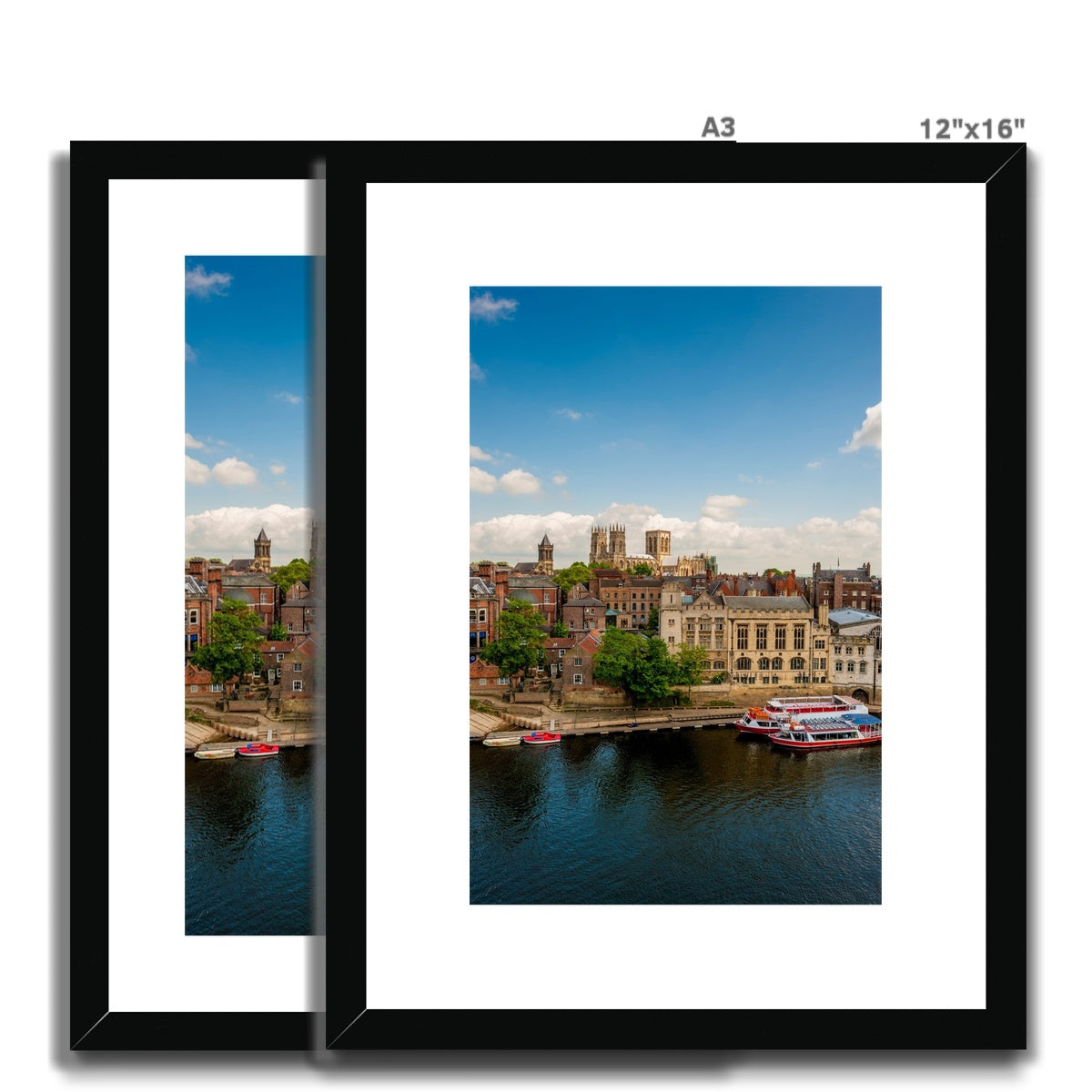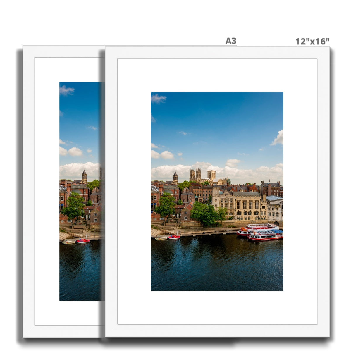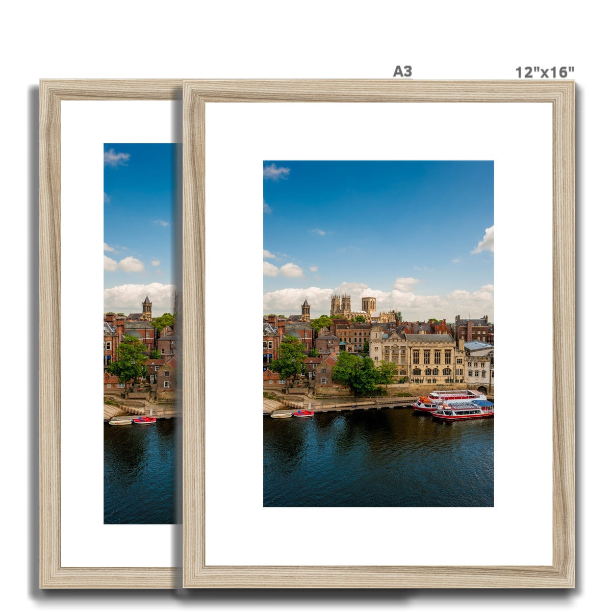 Moored boats on the River Ouse with the Guildhall and York Minster in the distance. York. UK Framed & Mounted Print