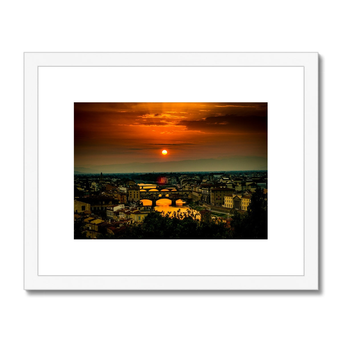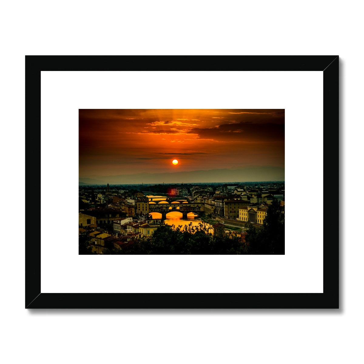 Ponte Vecchio at sunset and the river Arno. Florence, Italy. Framed & Mounted Print