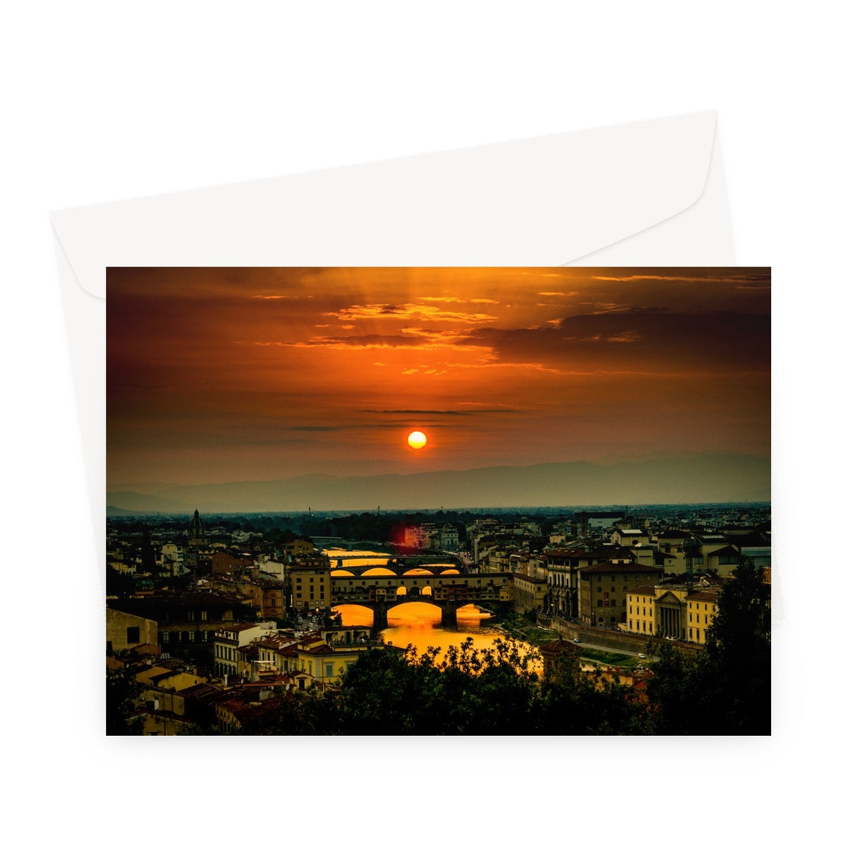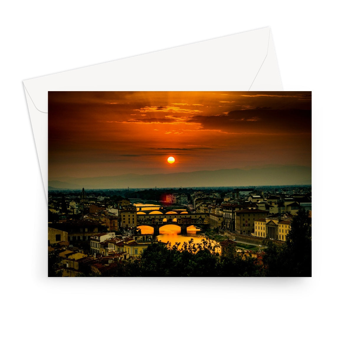 Ponte Vecchio at sunset and the river Arno. Florence, Italy. Greeting Card