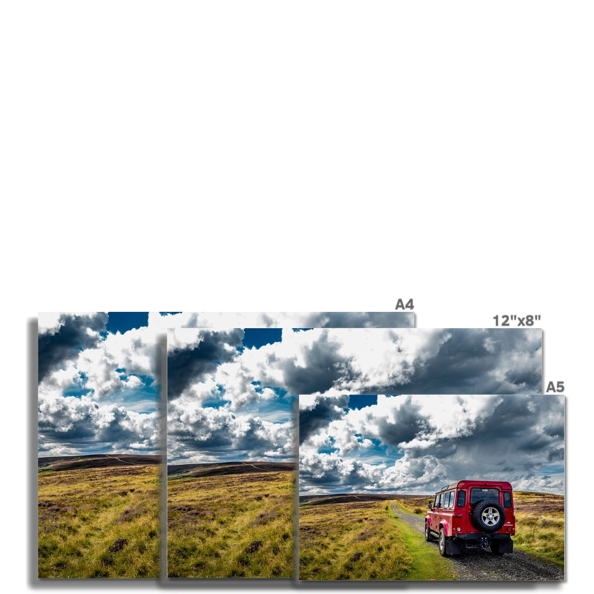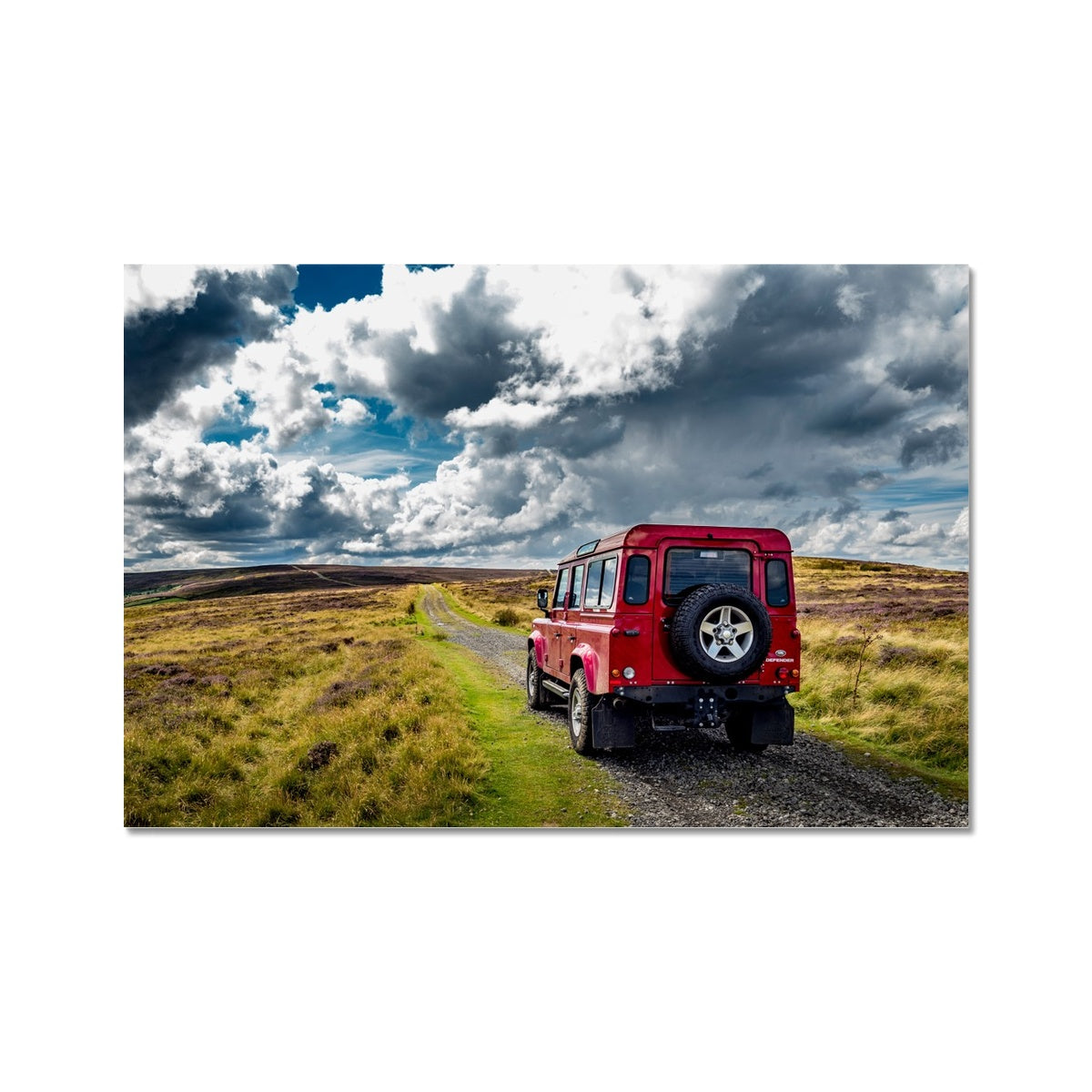 Red Land Rover Defender 110 4WD car navigating a Green Lane track, North Yorkshire Moors, UK. Fine Art Print