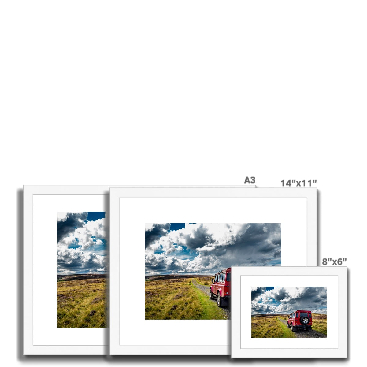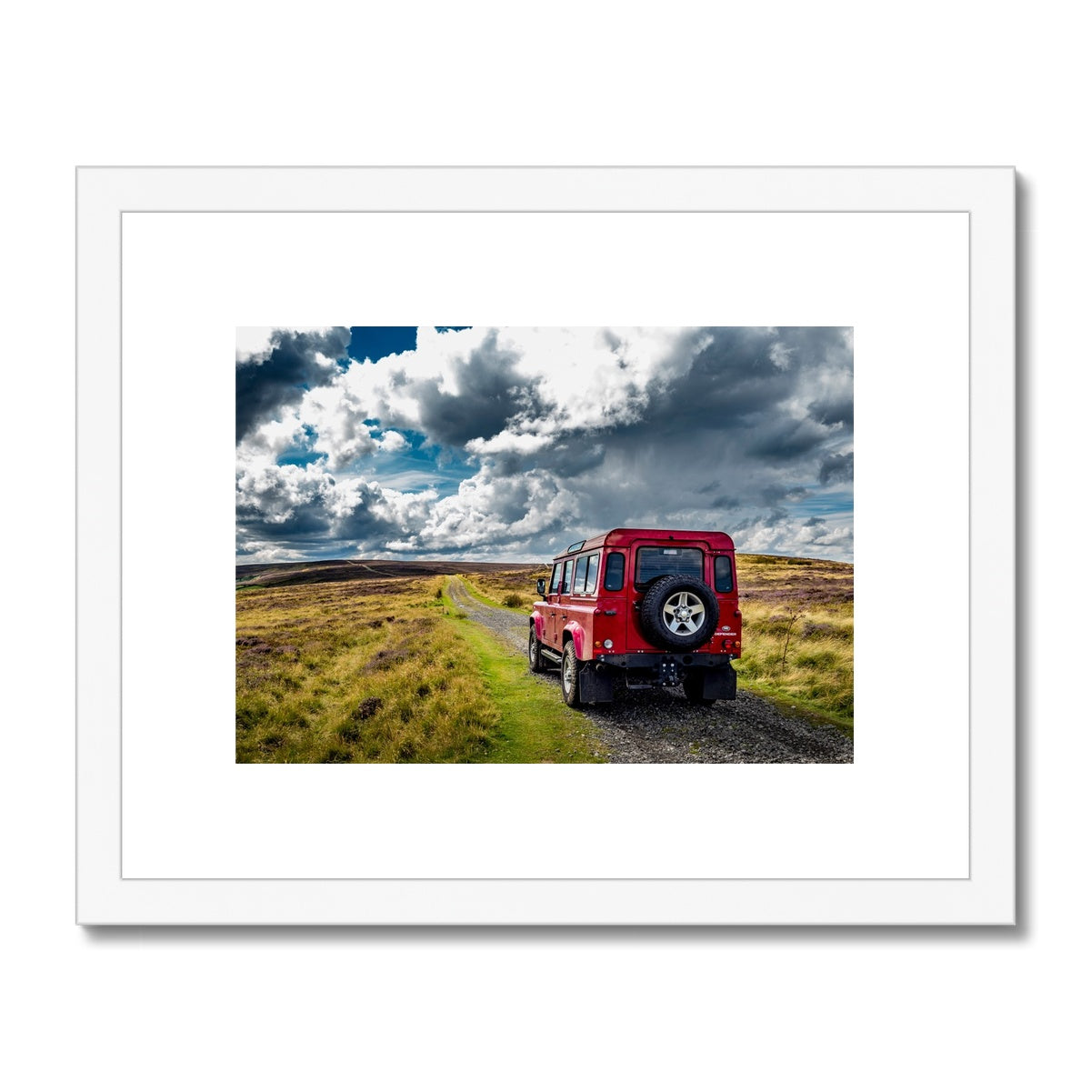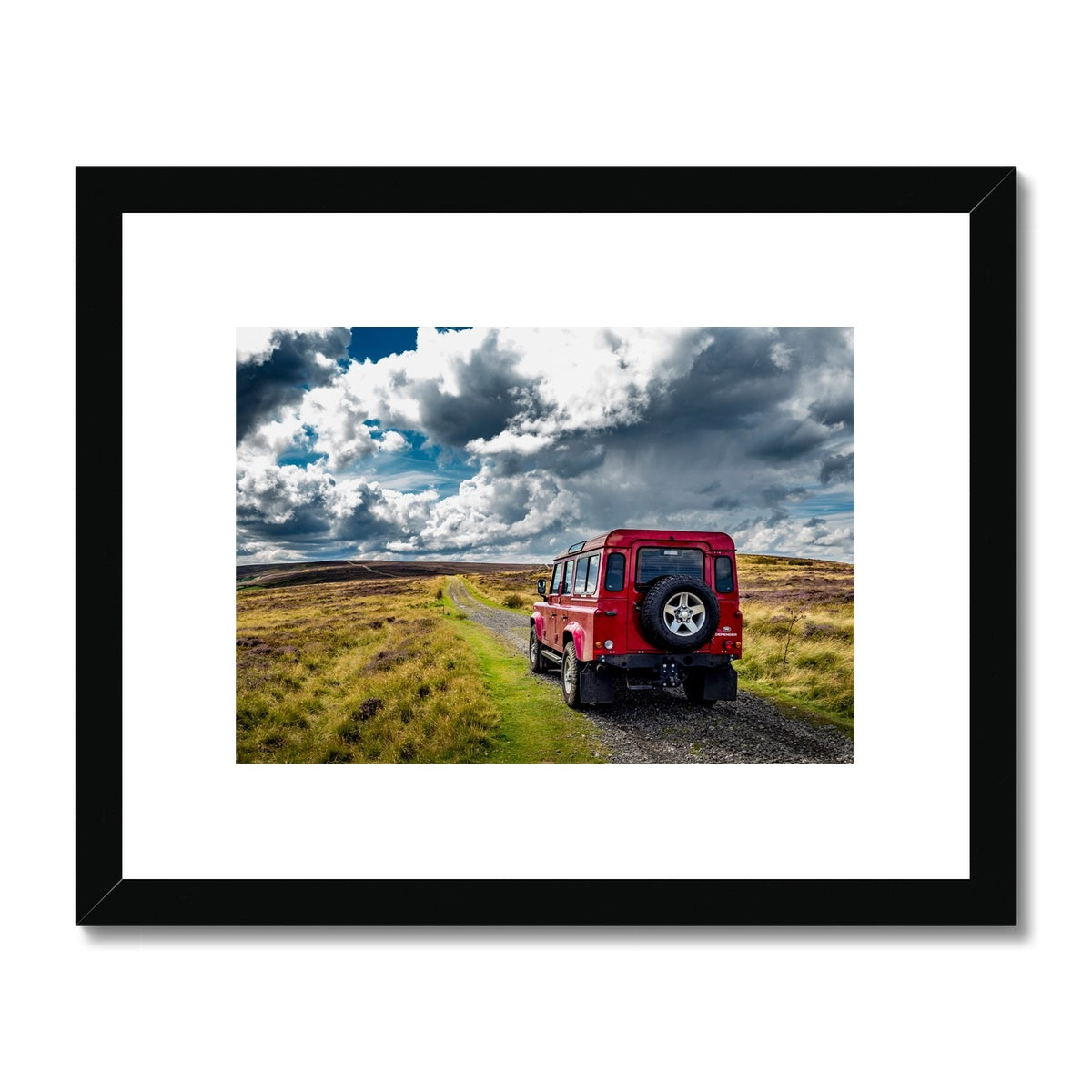 Red Land Rover Defender 110 4WD car navigating a Green Lane track, North Yorkshire Moors, UK. Framed & Mounted Print