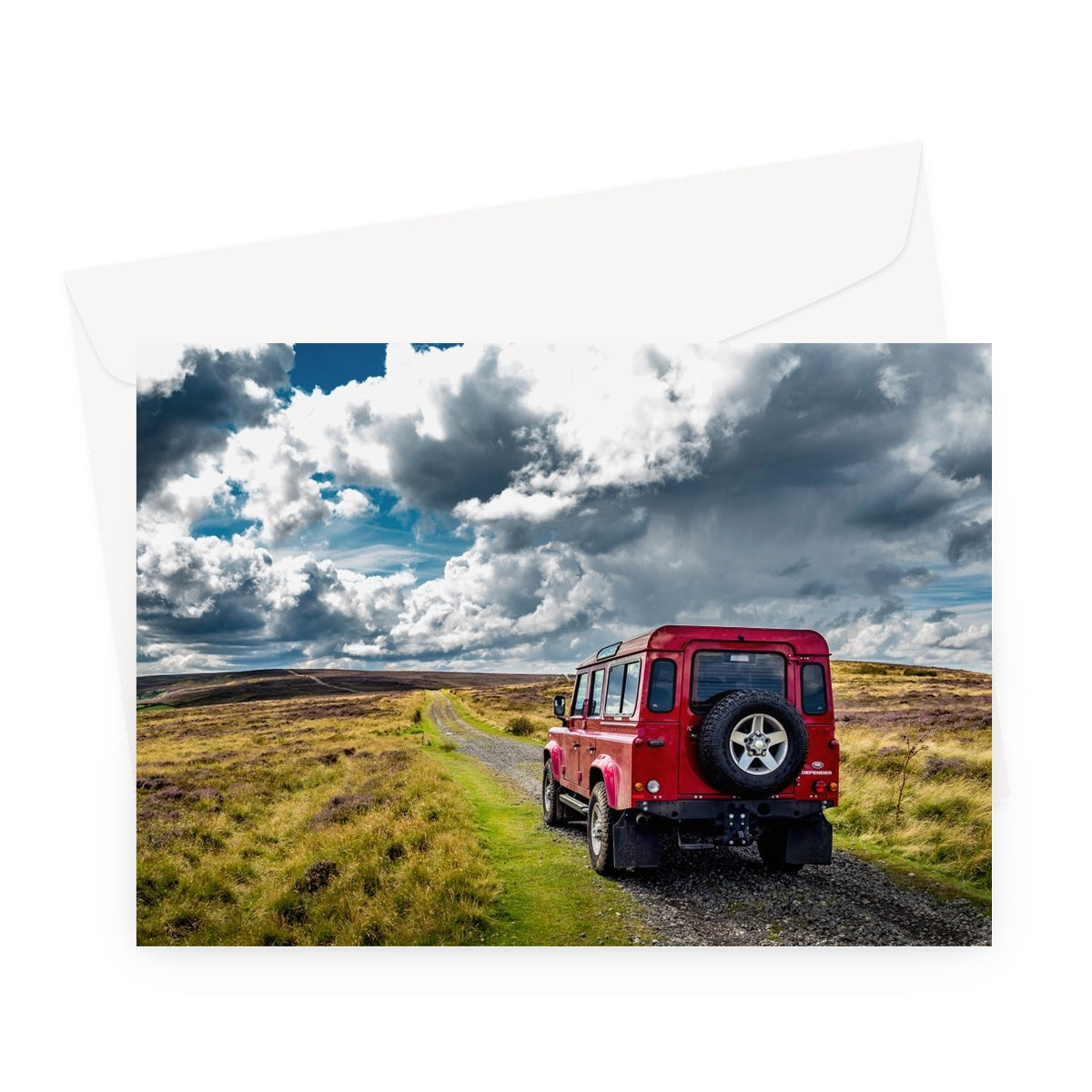 Red Land Rover Defender 110 4WD car navigating a Green Lane track, North Yorkshire Moors, UK. Greeting Card