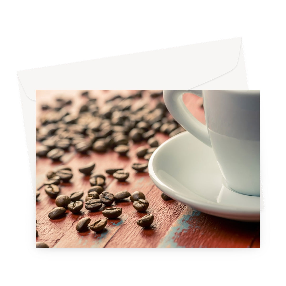 Roasted coffee beans on painted wooden board with white espresso cup and saucer Greeting Card