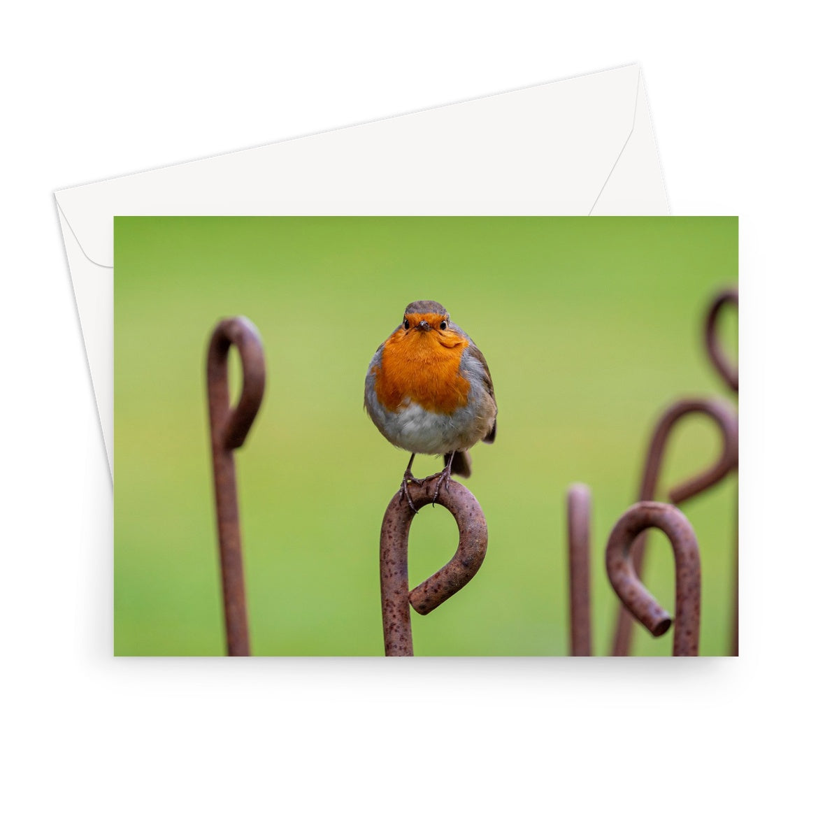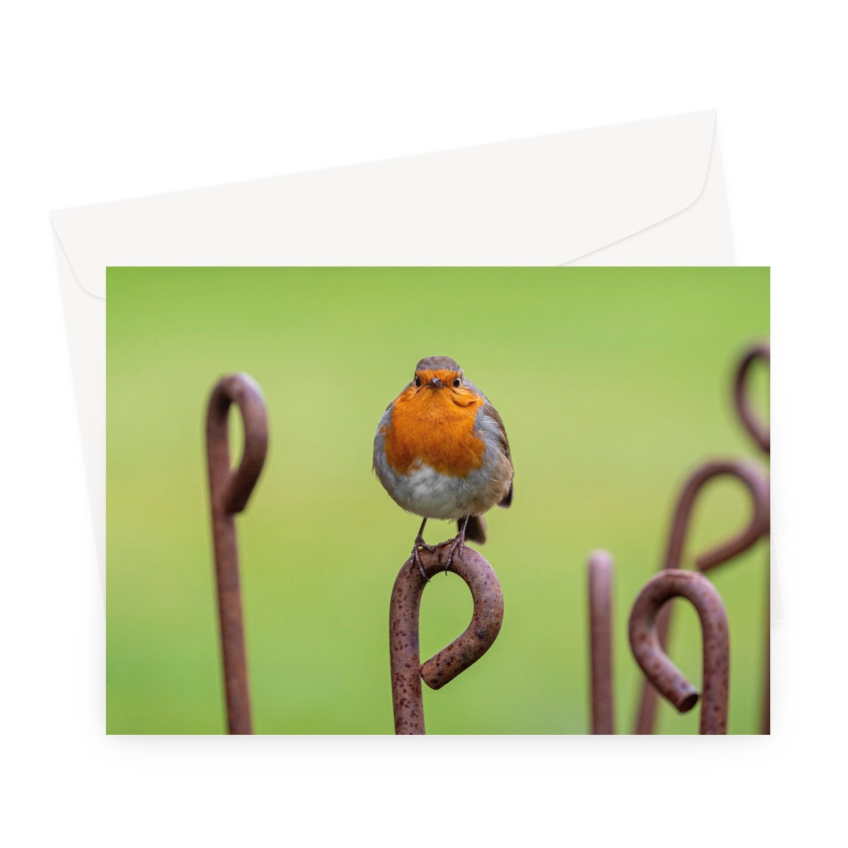 Robin sitting on a rusty metal stake in winter Greeting Card