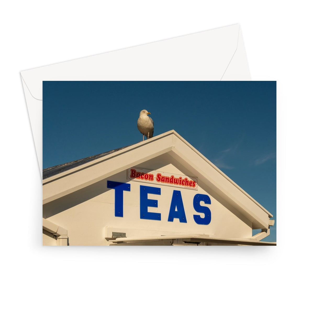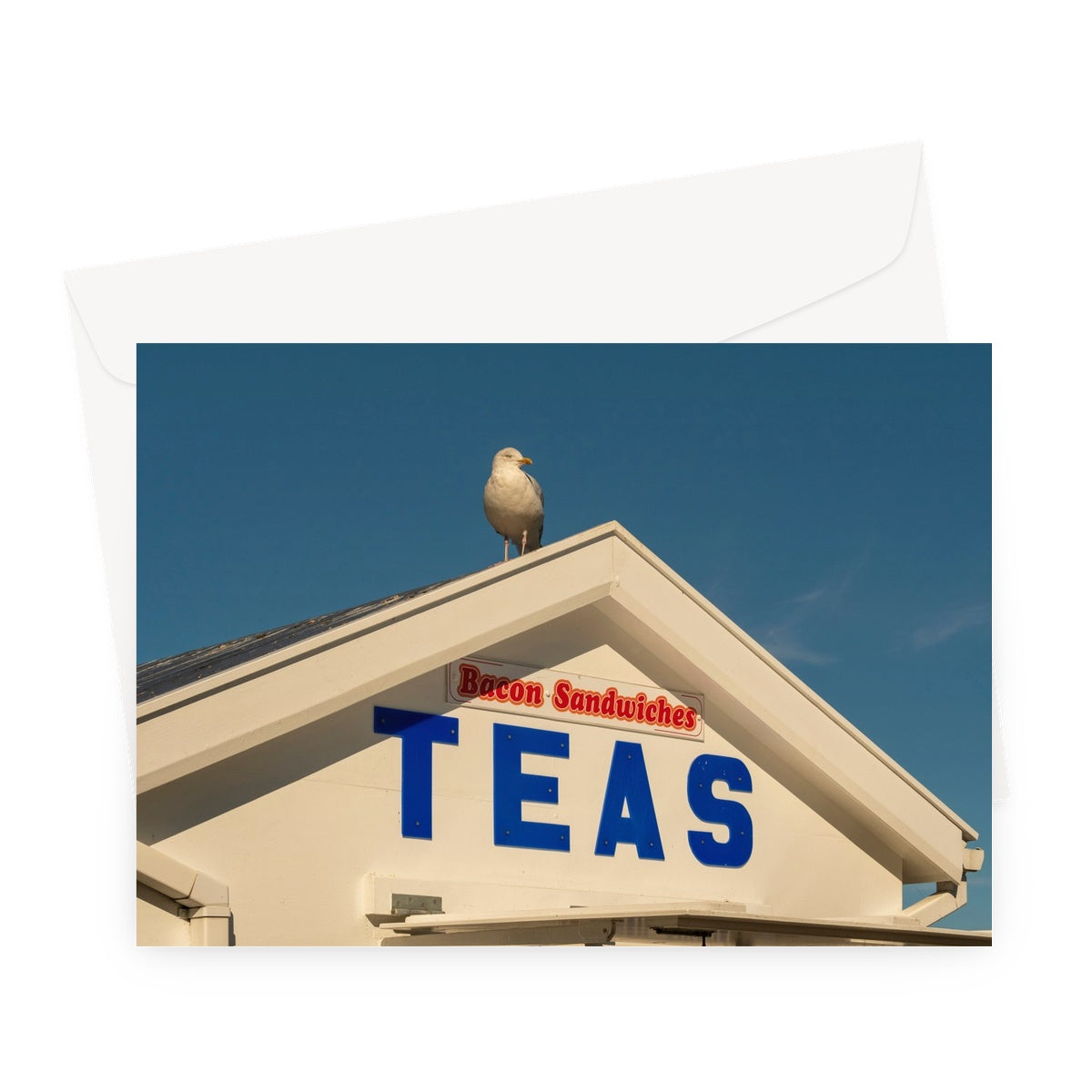 Seagull sitting on the roof of a catering kiosk selling tea and bacon sandwiches, Whitby, UK. Greeting Card