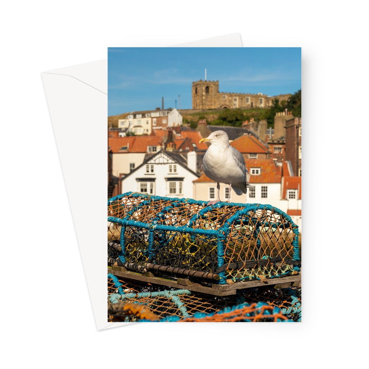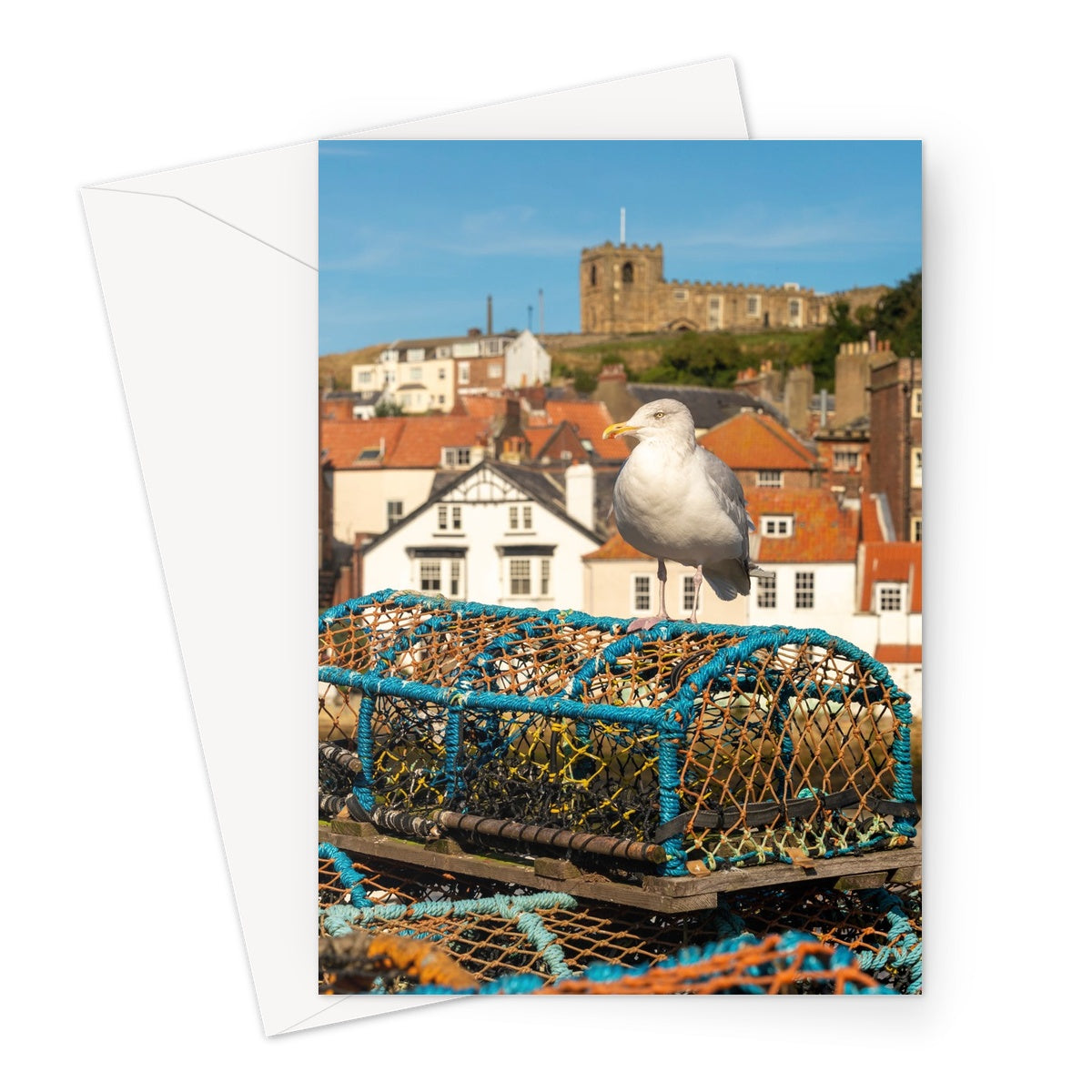 Seagull standing on a lobster trap on the quayside of Whitby harbour with St Mary's church in the distance. Whitby, UK. Greeting Card