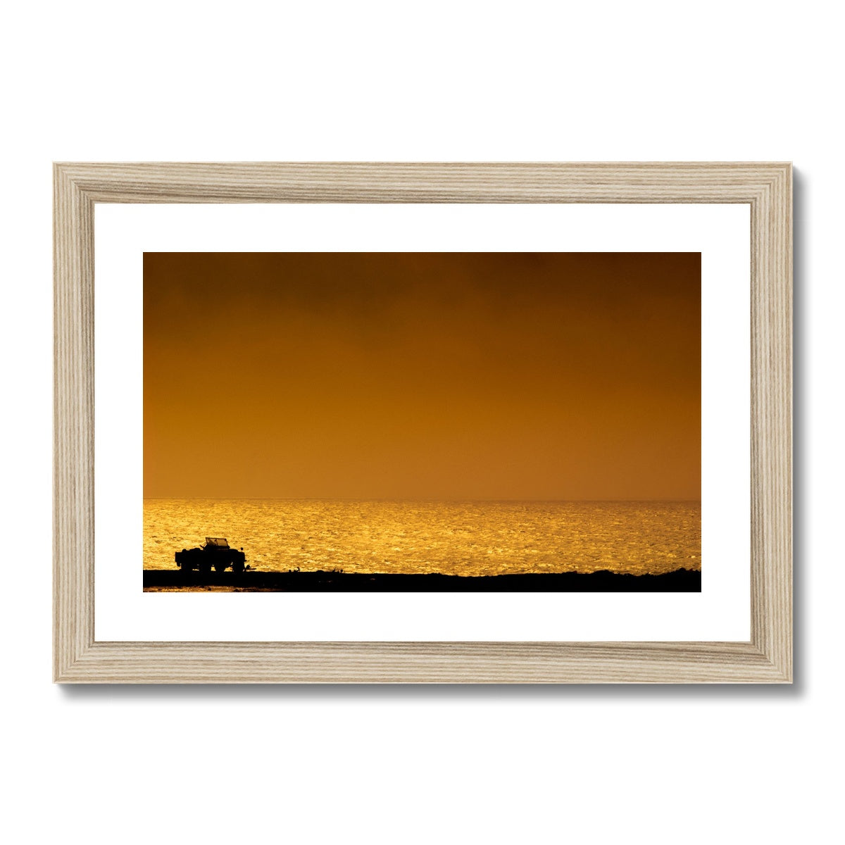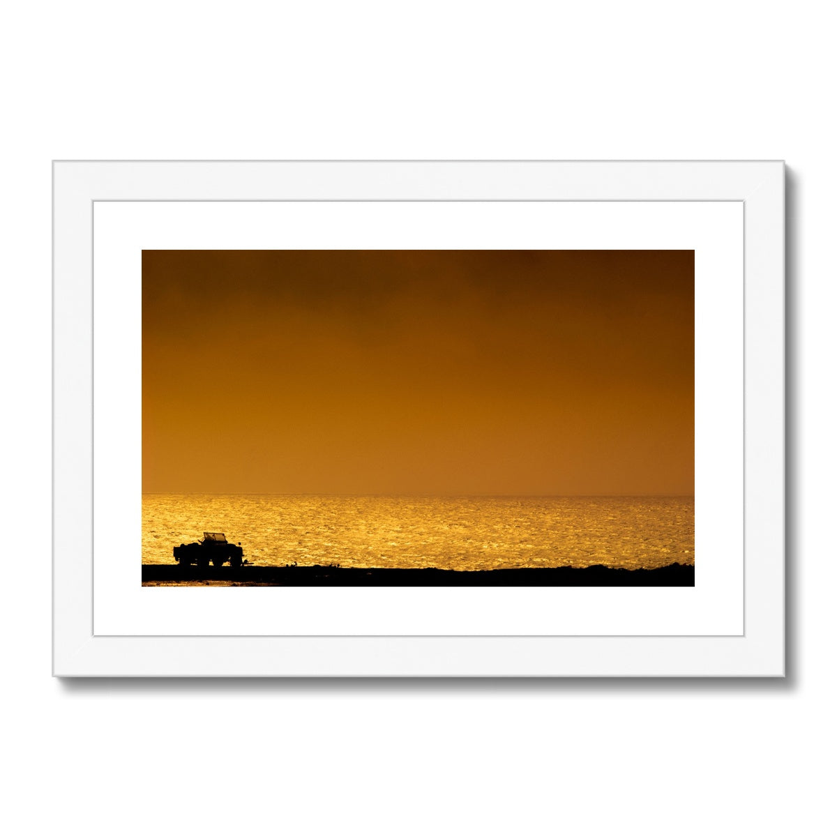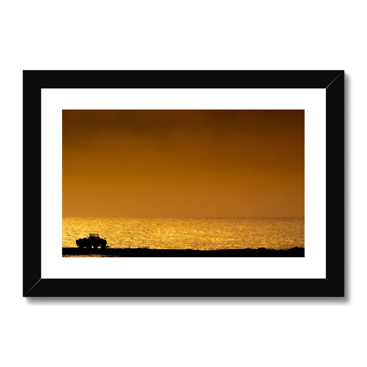 Silhouette of jeep on beach at sunset Framed & Mounted Print