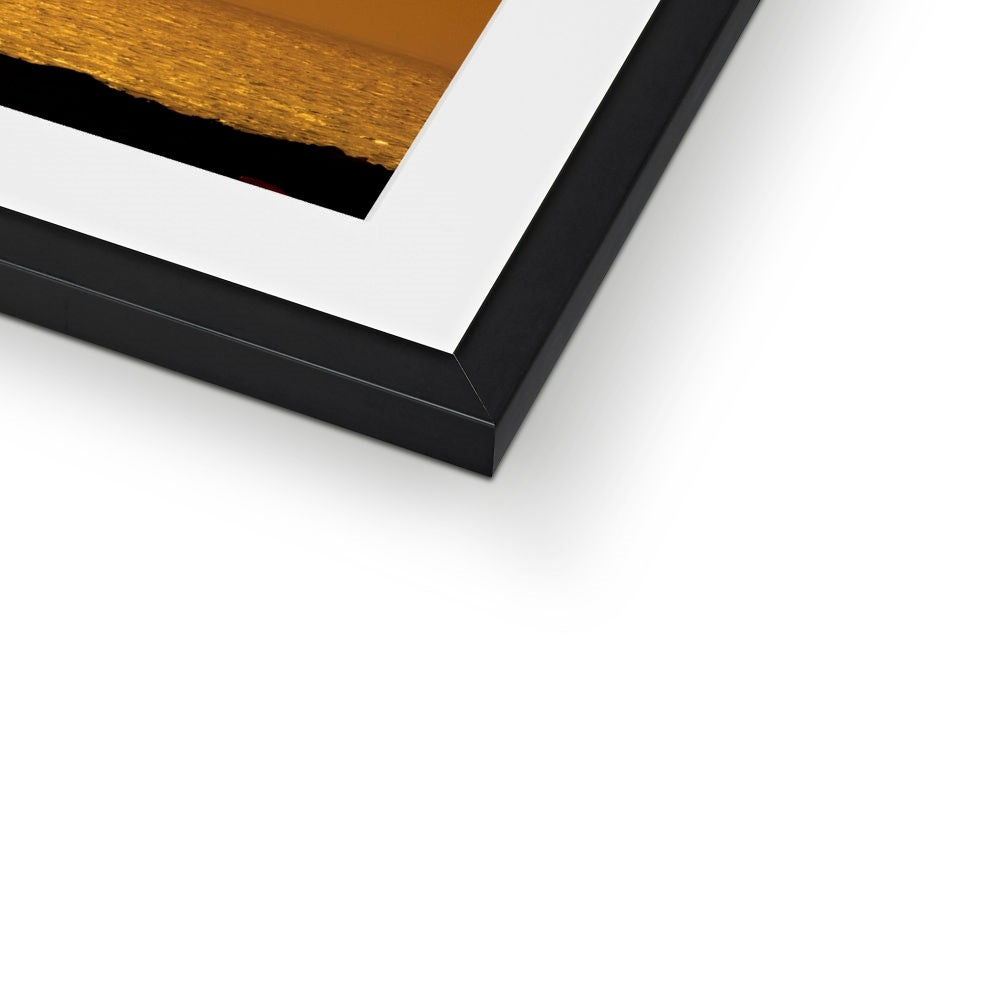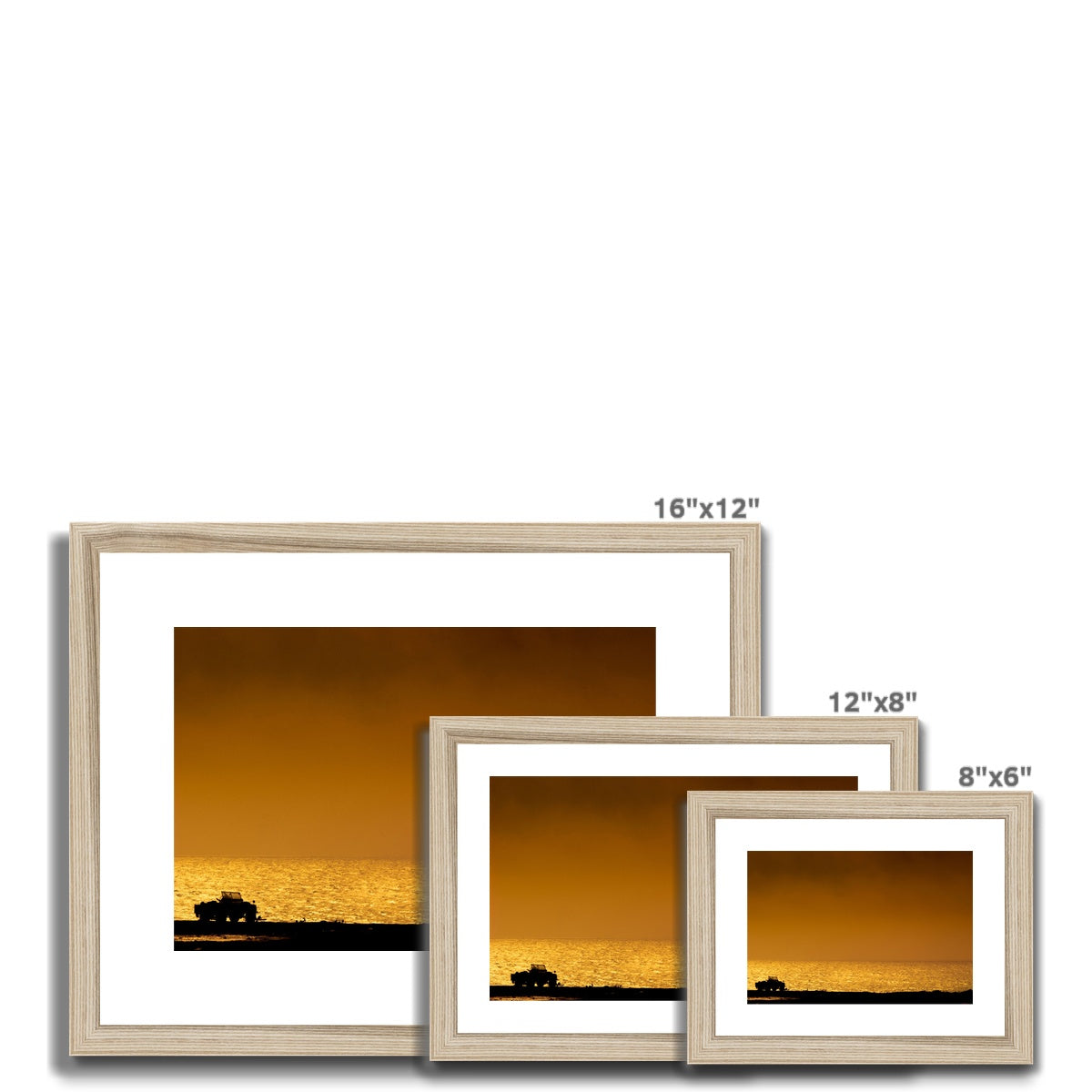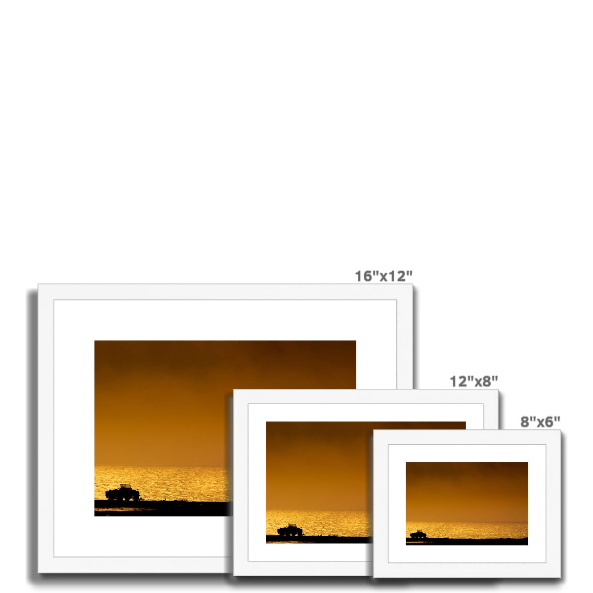 Silhouette of jeep on beach at sunset Framed & Mounted Print