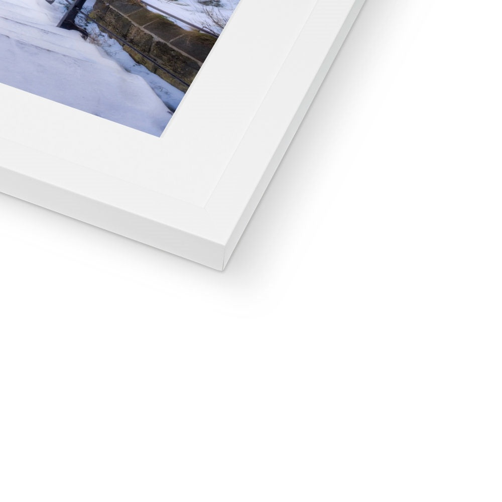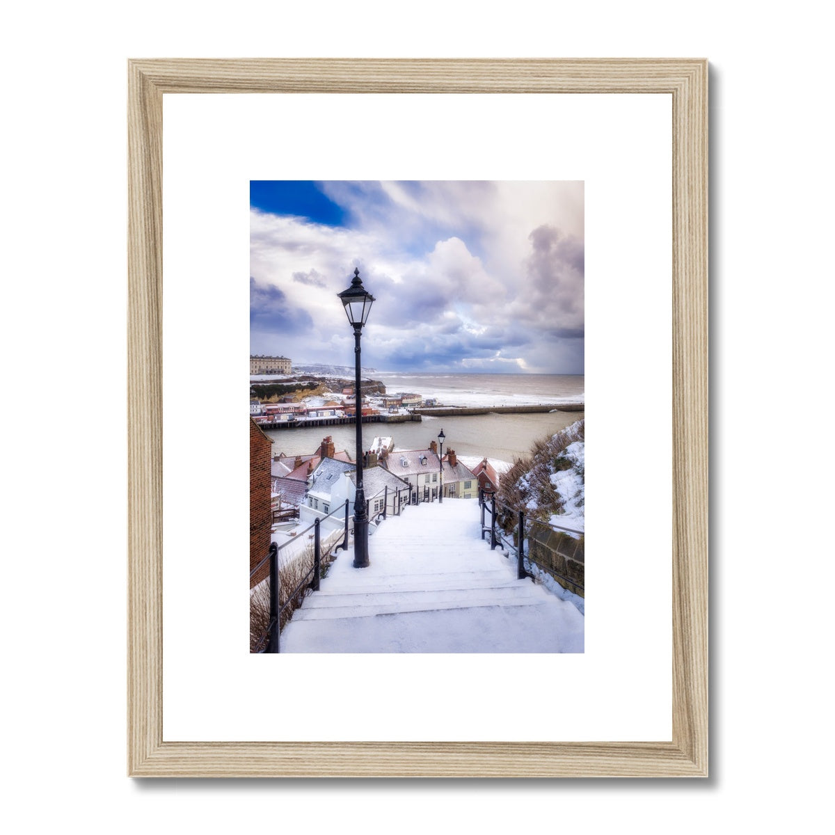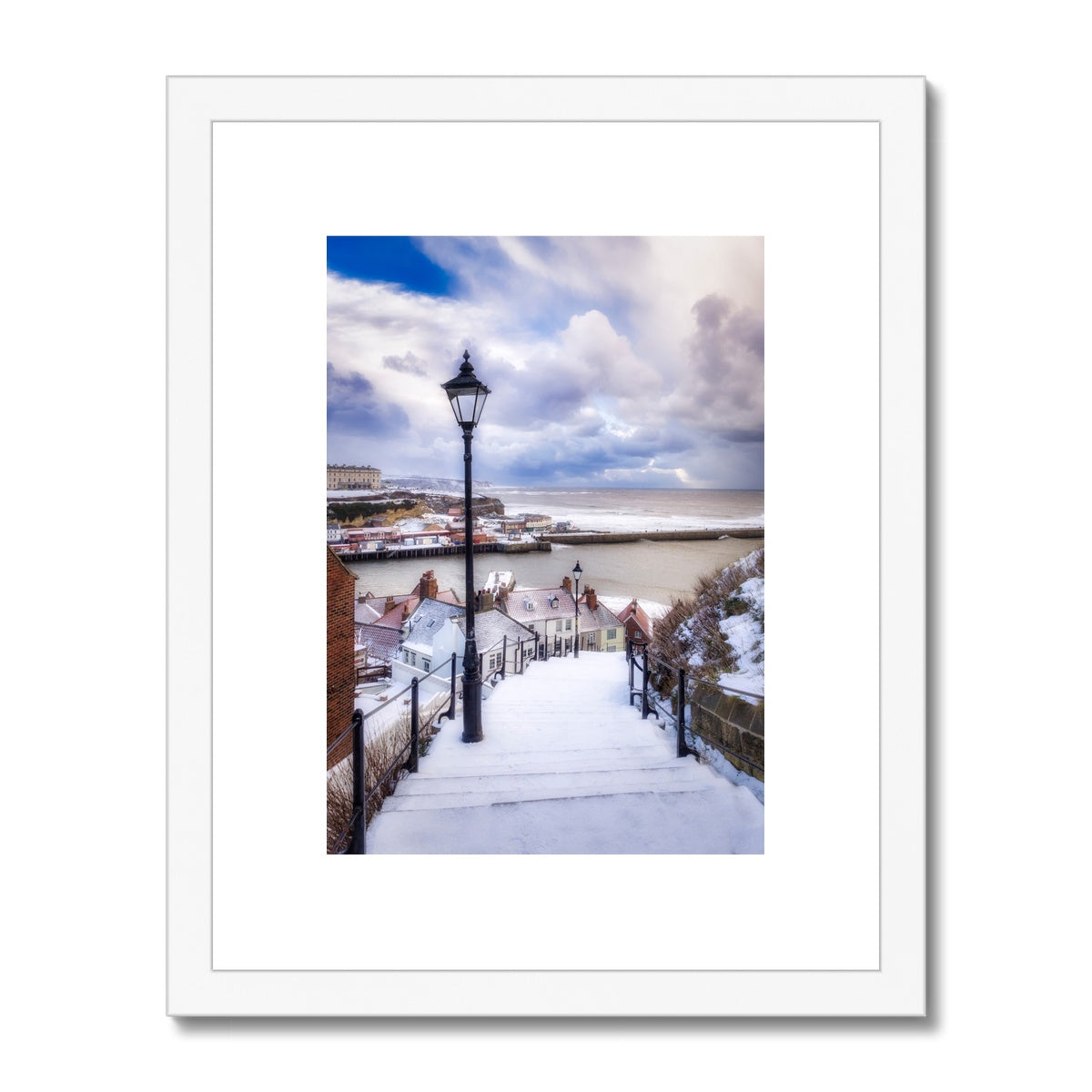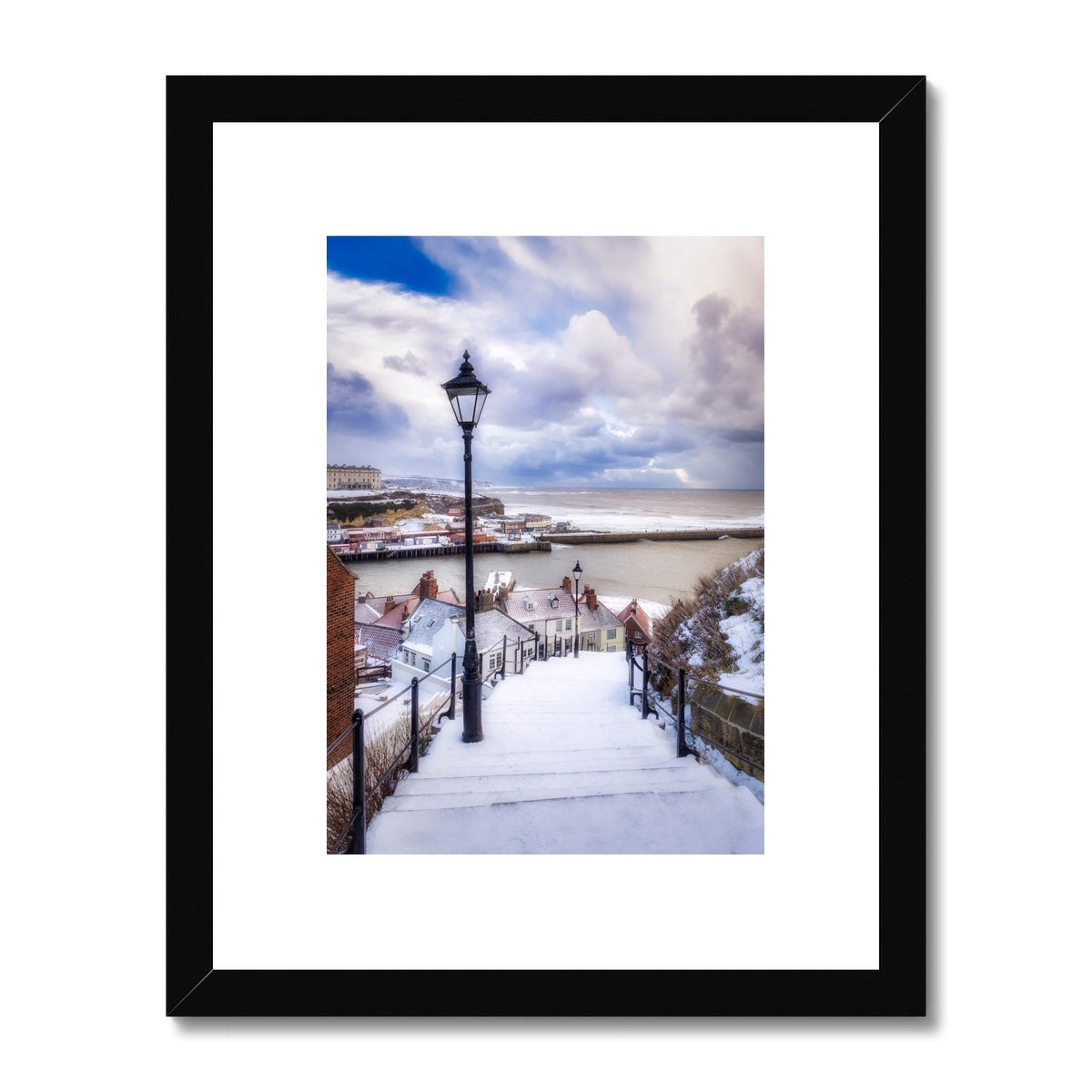 Snow covered steps leading down from St Mary's Church, Whitby, UK. Framed & Mounted Print