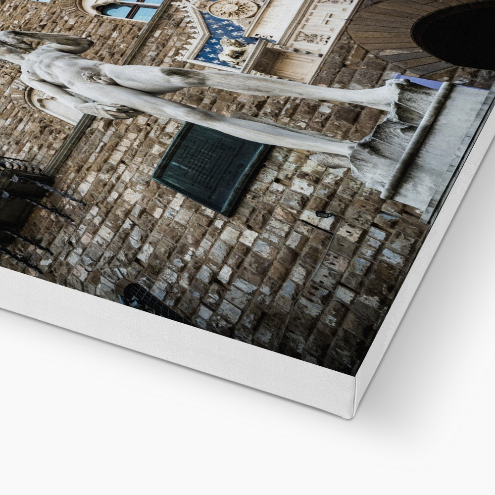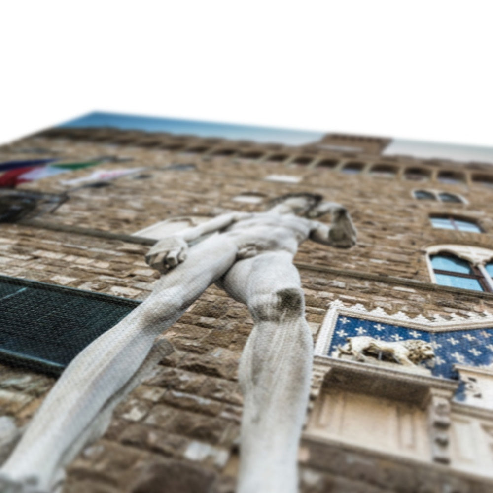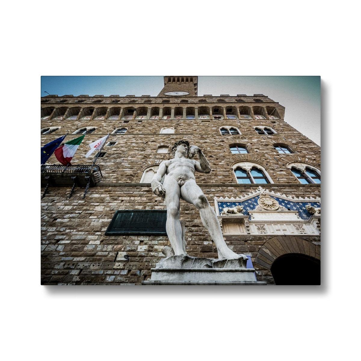 Statue of David overlooking Piazza della Signoria, with Palazzo Vecchio behind. Florence, Italy. Canvas