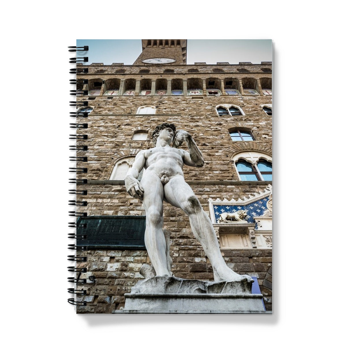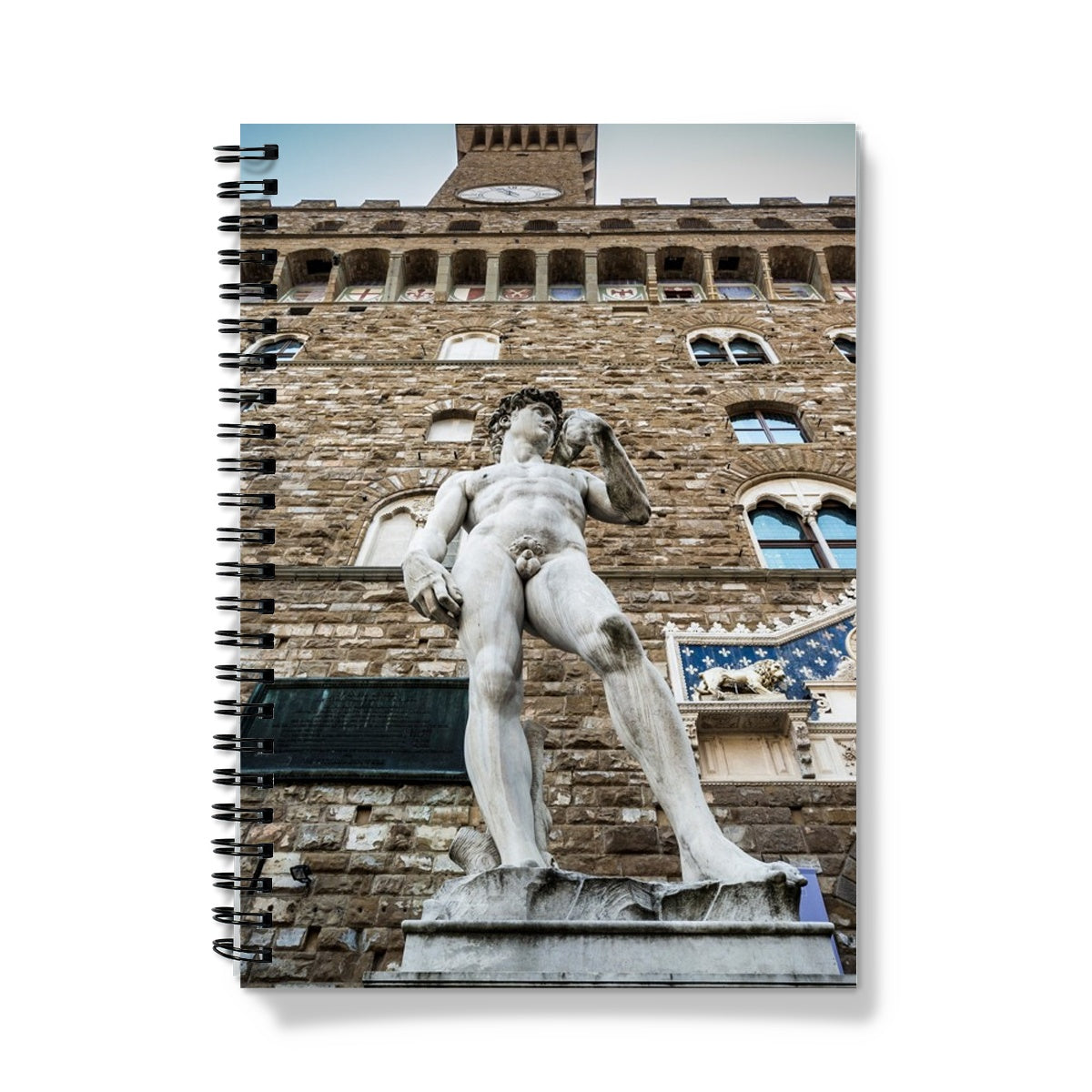 Statue of David overlooking Piazza della Signoria, with Palazzo Vecchio behind. Florence, Italy. Notebook