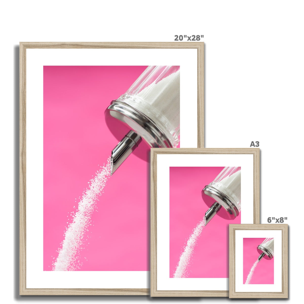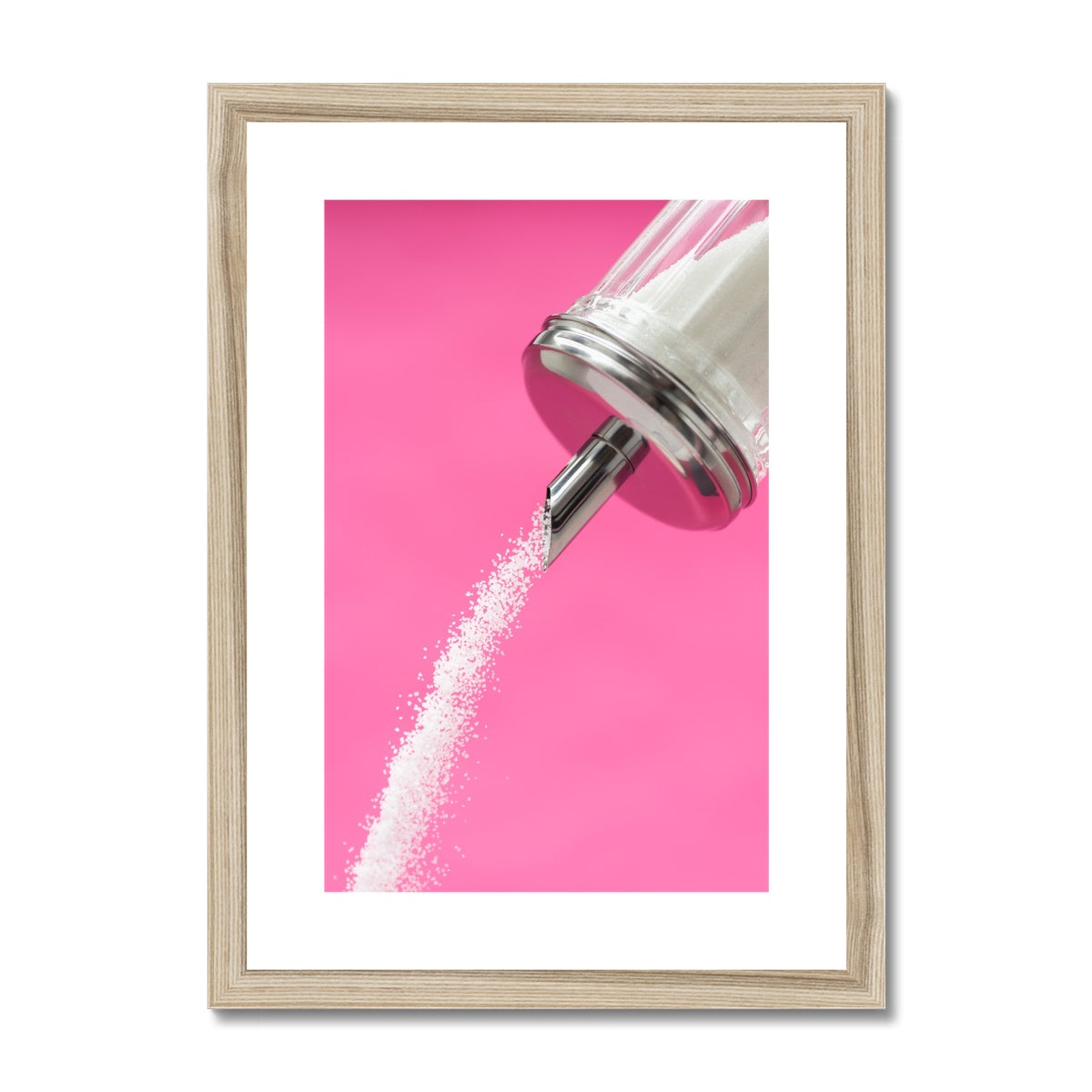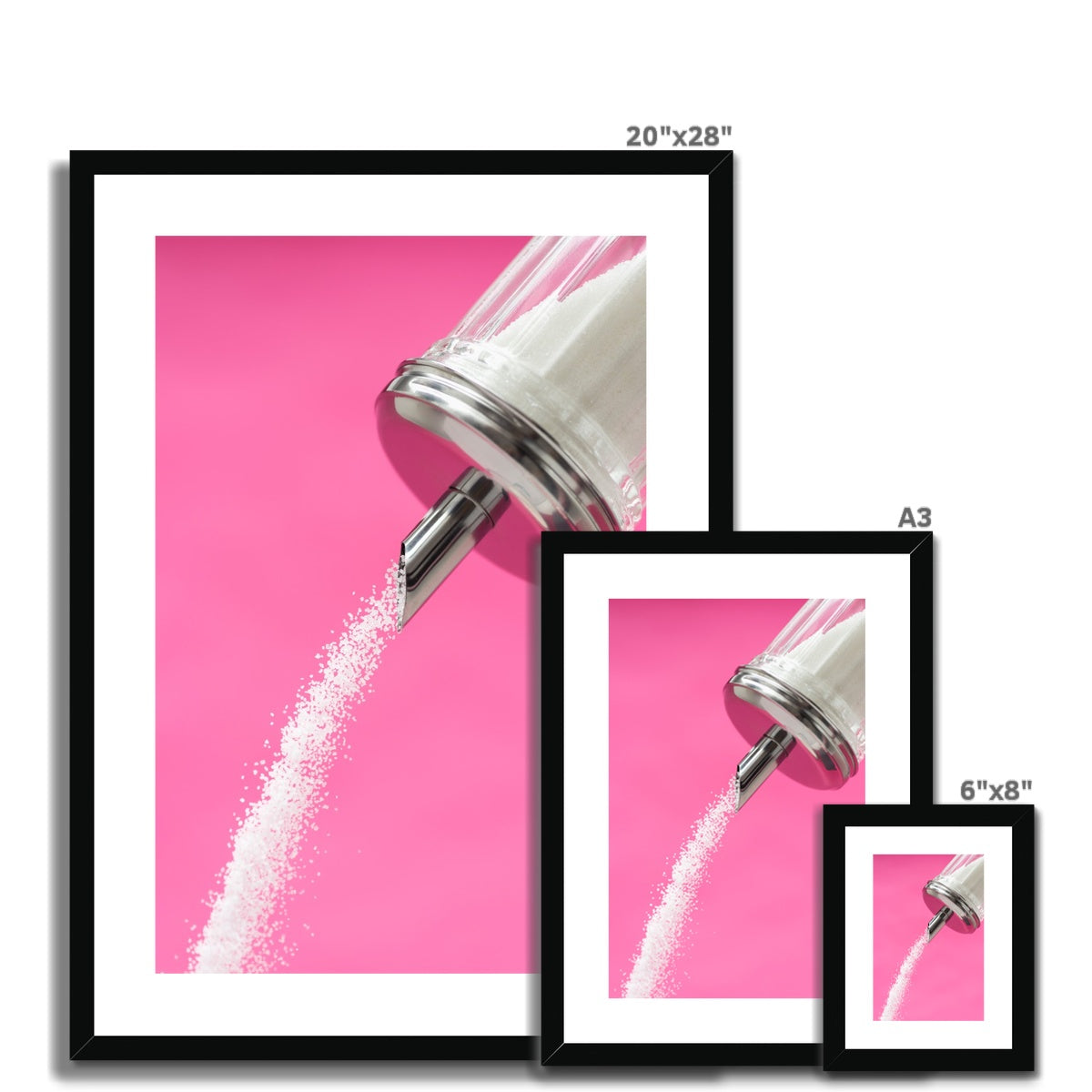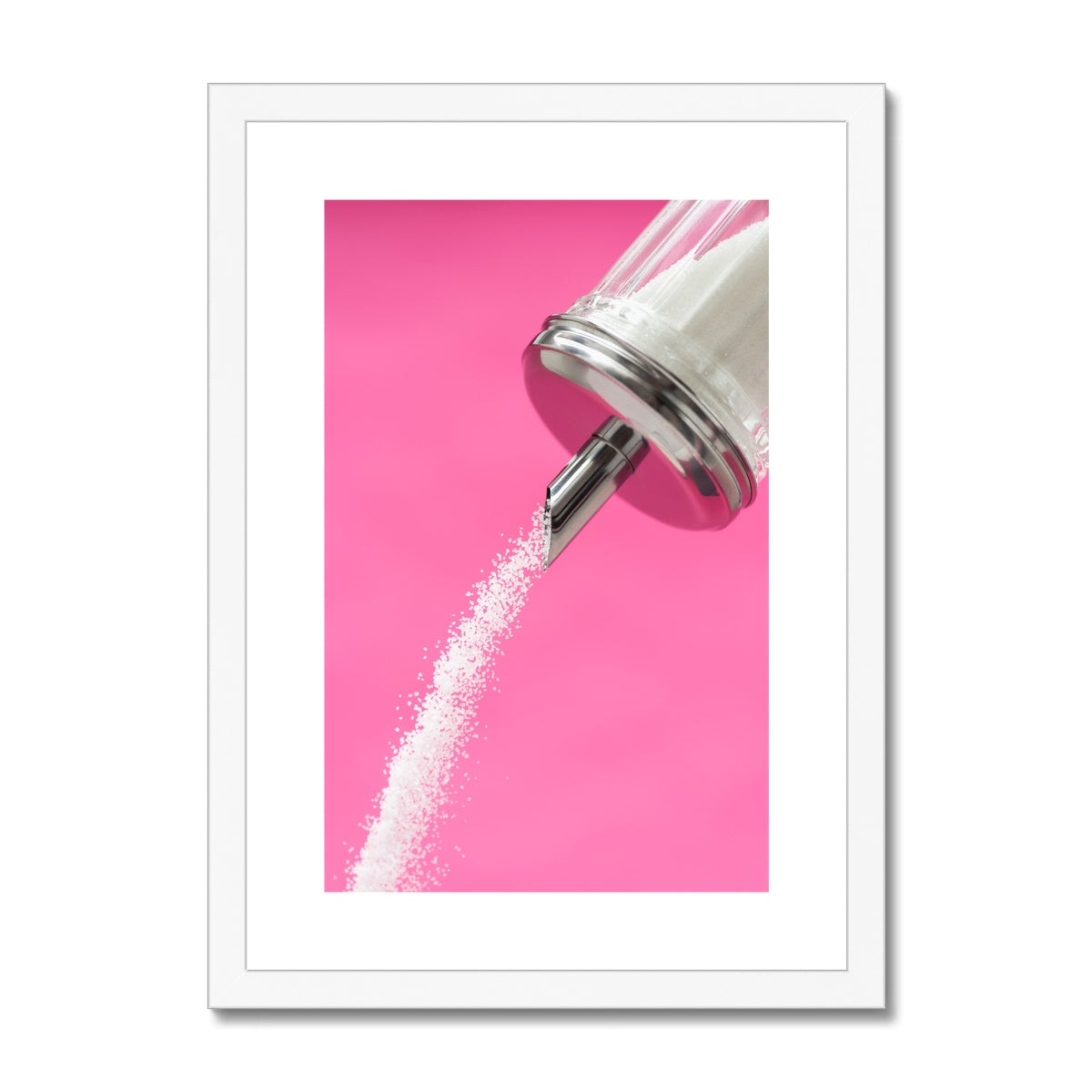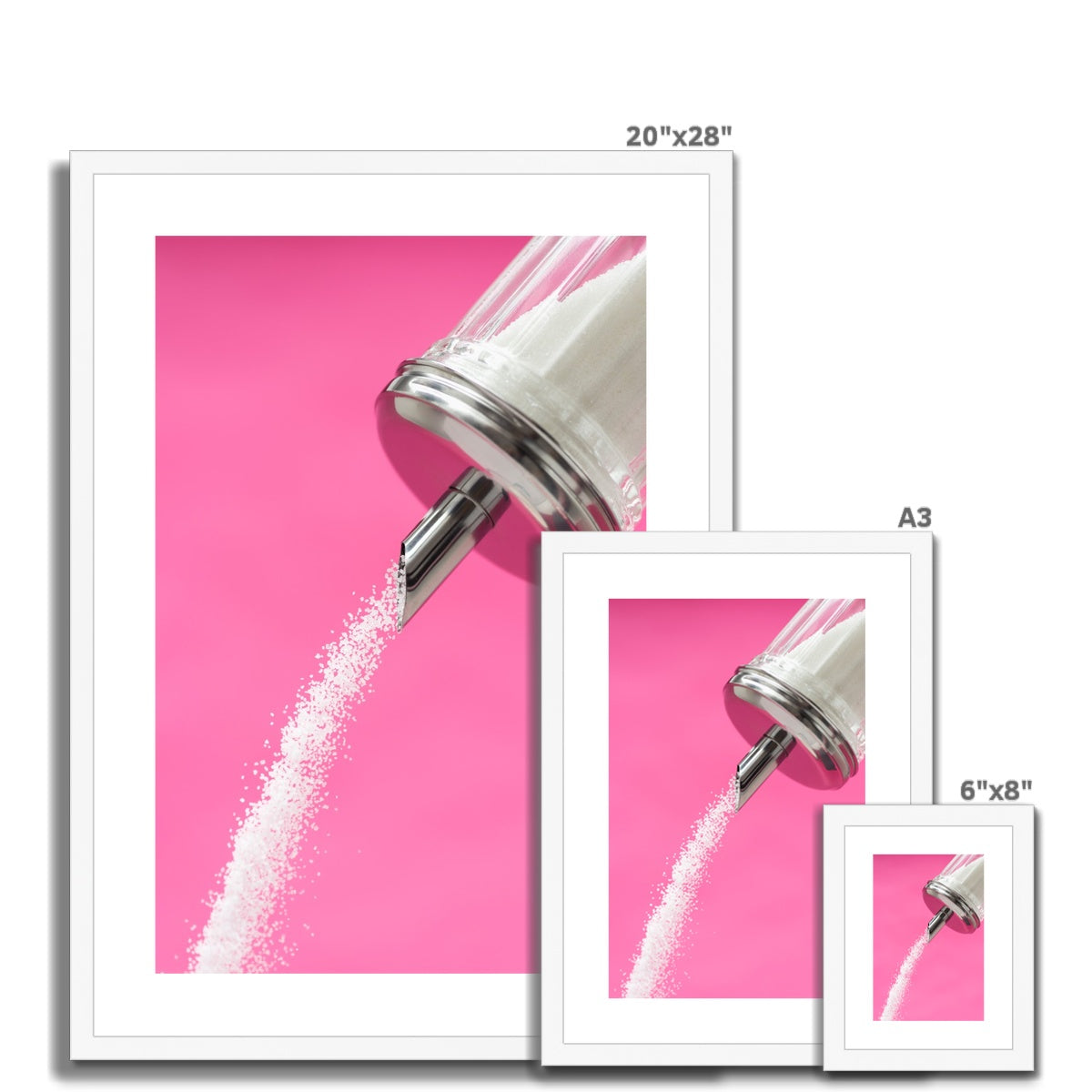 Sugar dispenser pouring against pink background Framed & Mounted Print