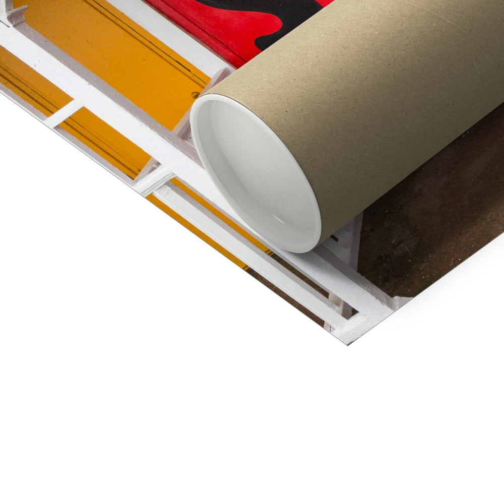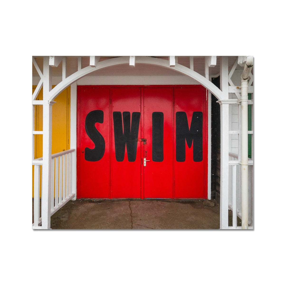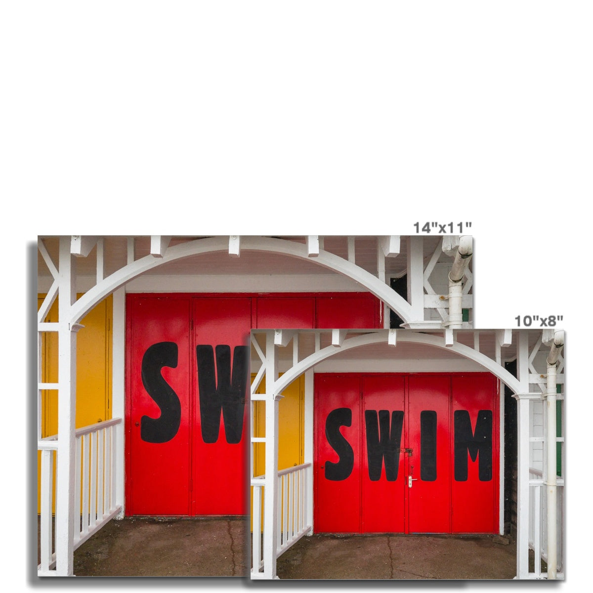 SWIM painted in bold letters on the red doors of a Scarborough beach hut. Fine Art Print