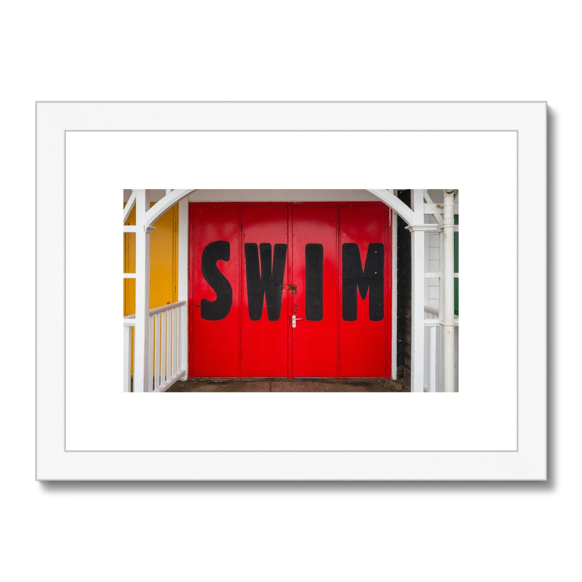 SWIM painted in bold letters on the red doors of a Scarborough beach hut. Framed & Mounted Print