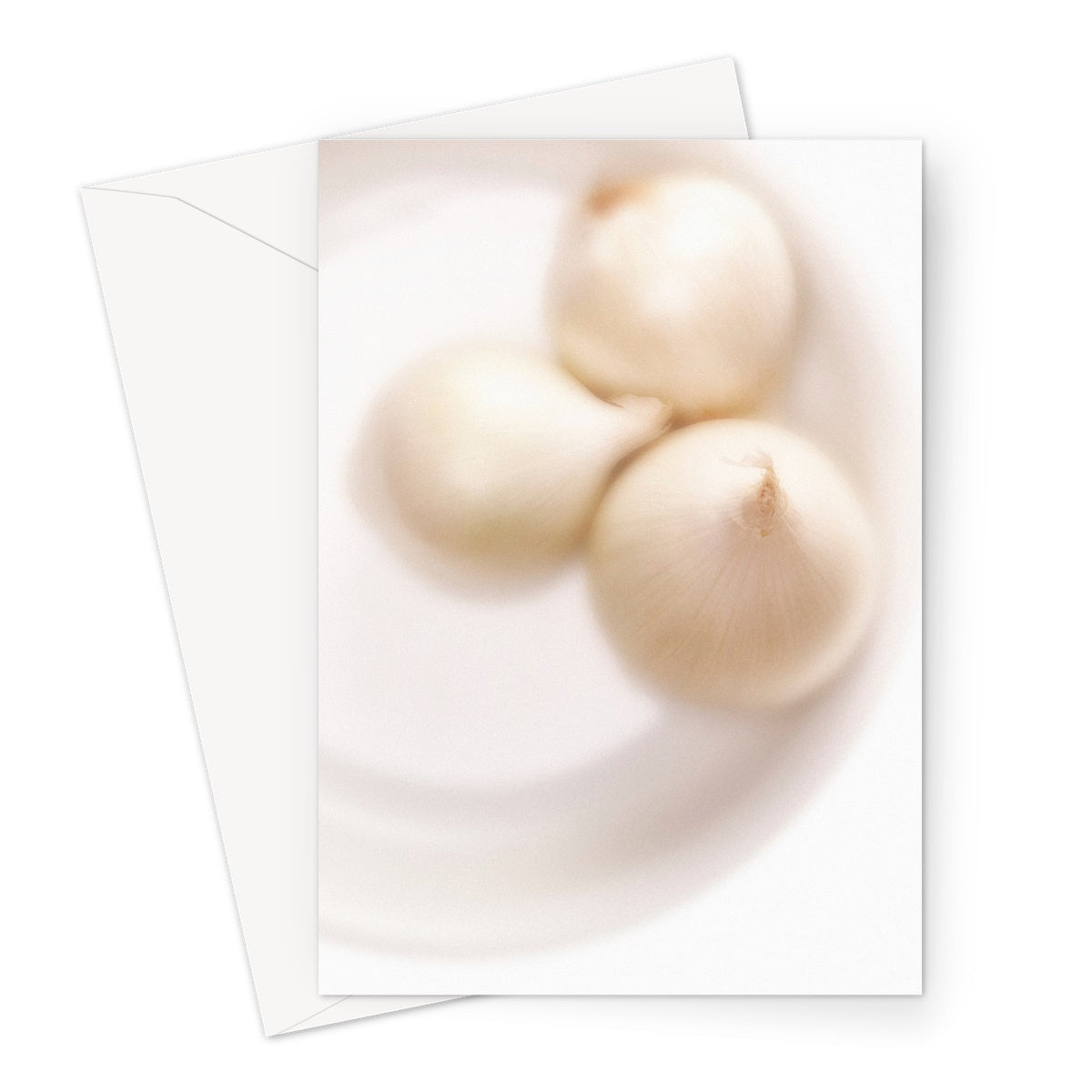 Three white onions on white plate Greeting Card
