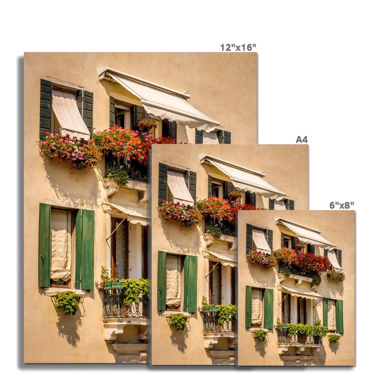 Traditional canal-side cream-rendered house with shuttered windows and window boxes. Venice. Italy. Fine Art Print