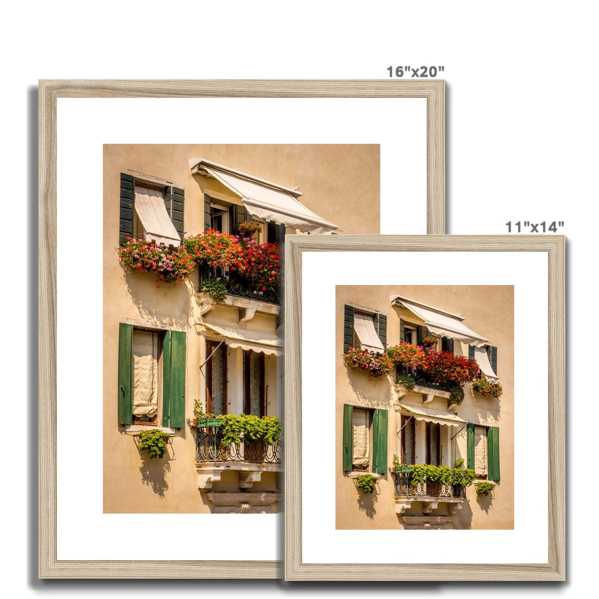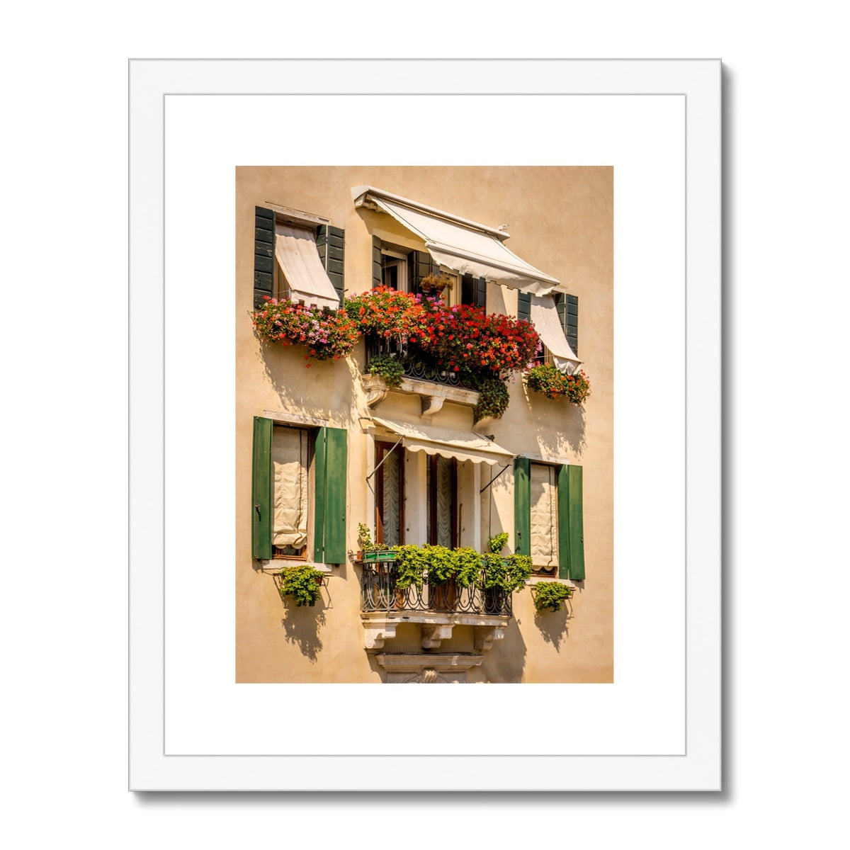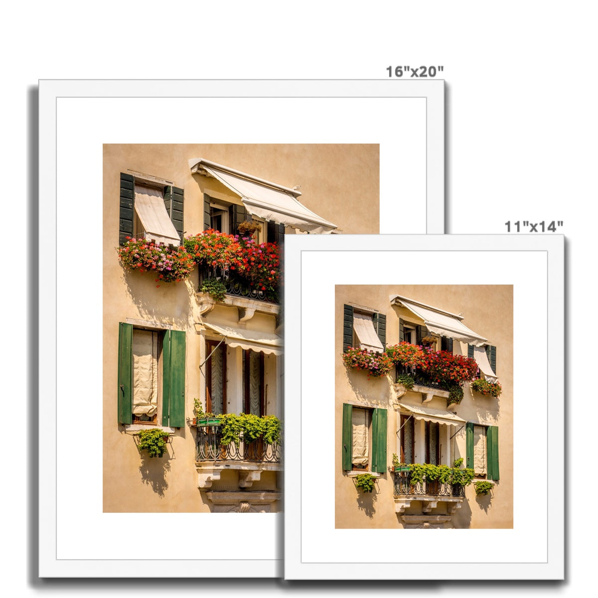 Traditional canal-side cream-rendered house with shuttered windows and window boxes. Venice. Italy. Framed & Mounted Print