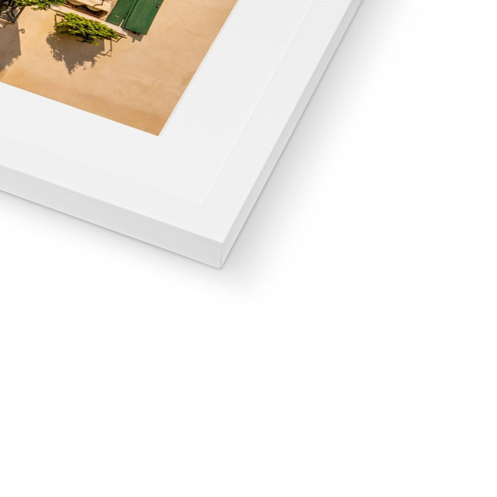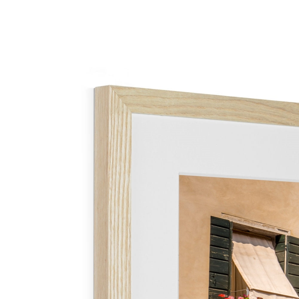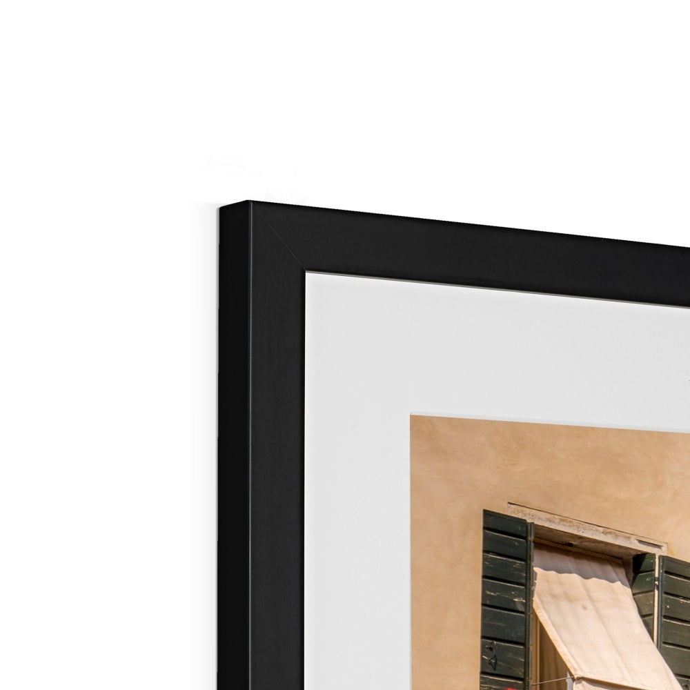 Traditional canal-side cream-rendered house with shuttered windows and window boxes. Venice. Italy. Framed & Mounted Print