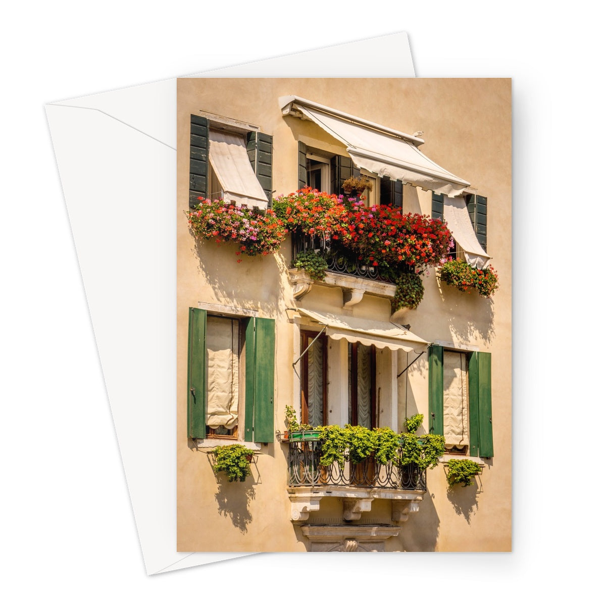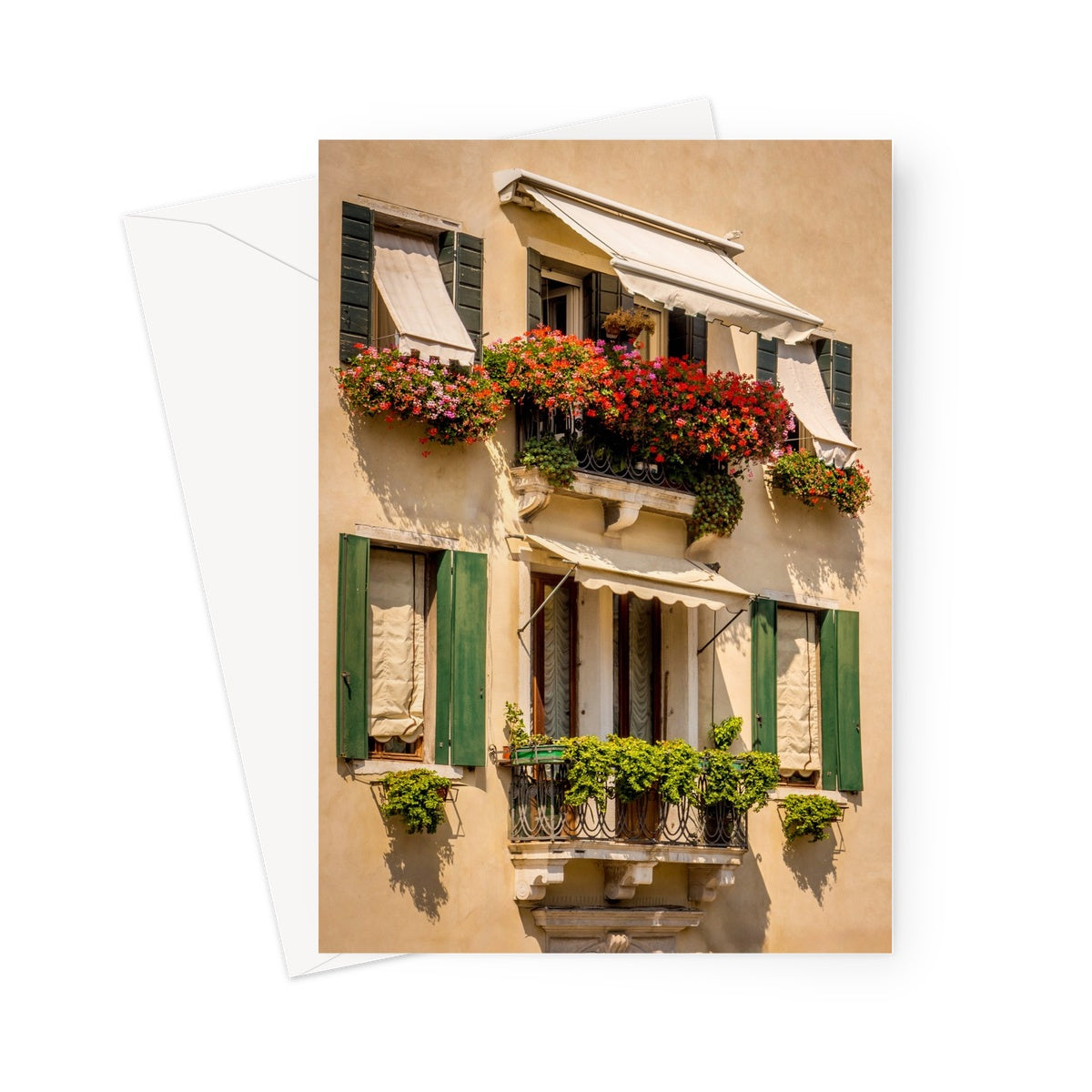 Traditional canal-side cream-rendered house with shuttered windows and window boxes. Venice. Italy. Greeting Card