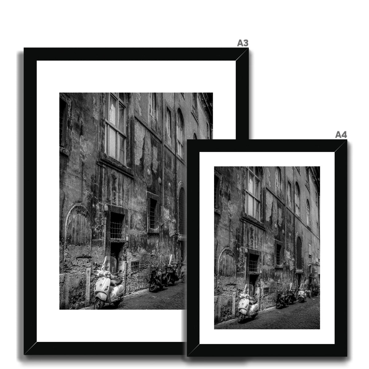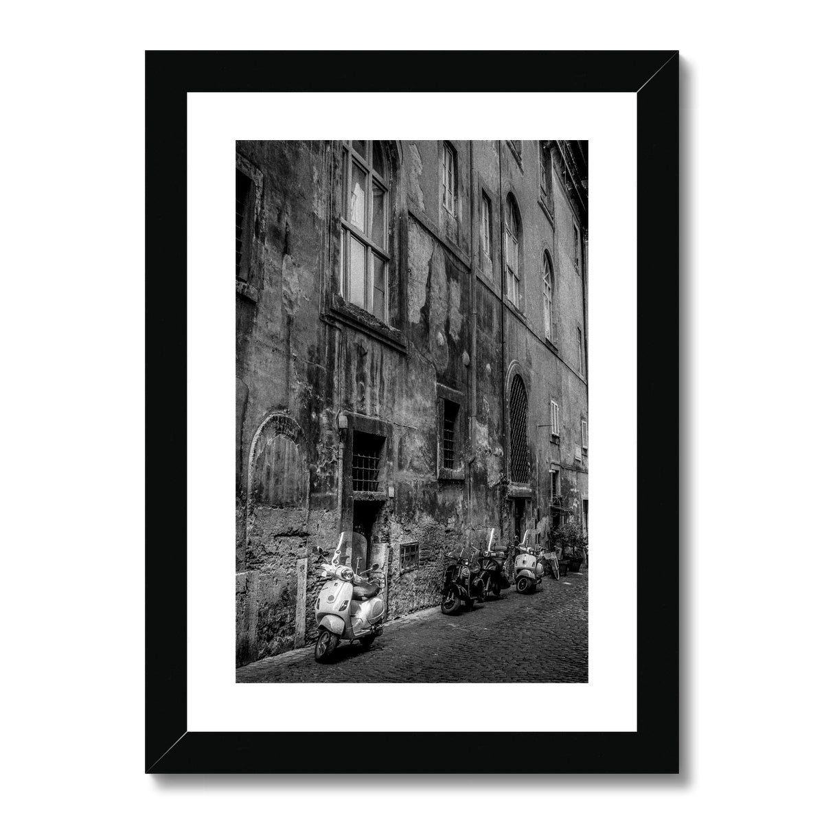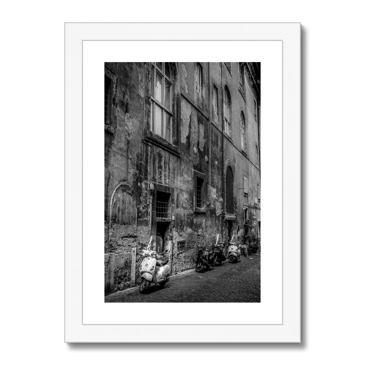 Typical street with parked scooters in the centre of Rome. Italy. Framed & Mounted Print