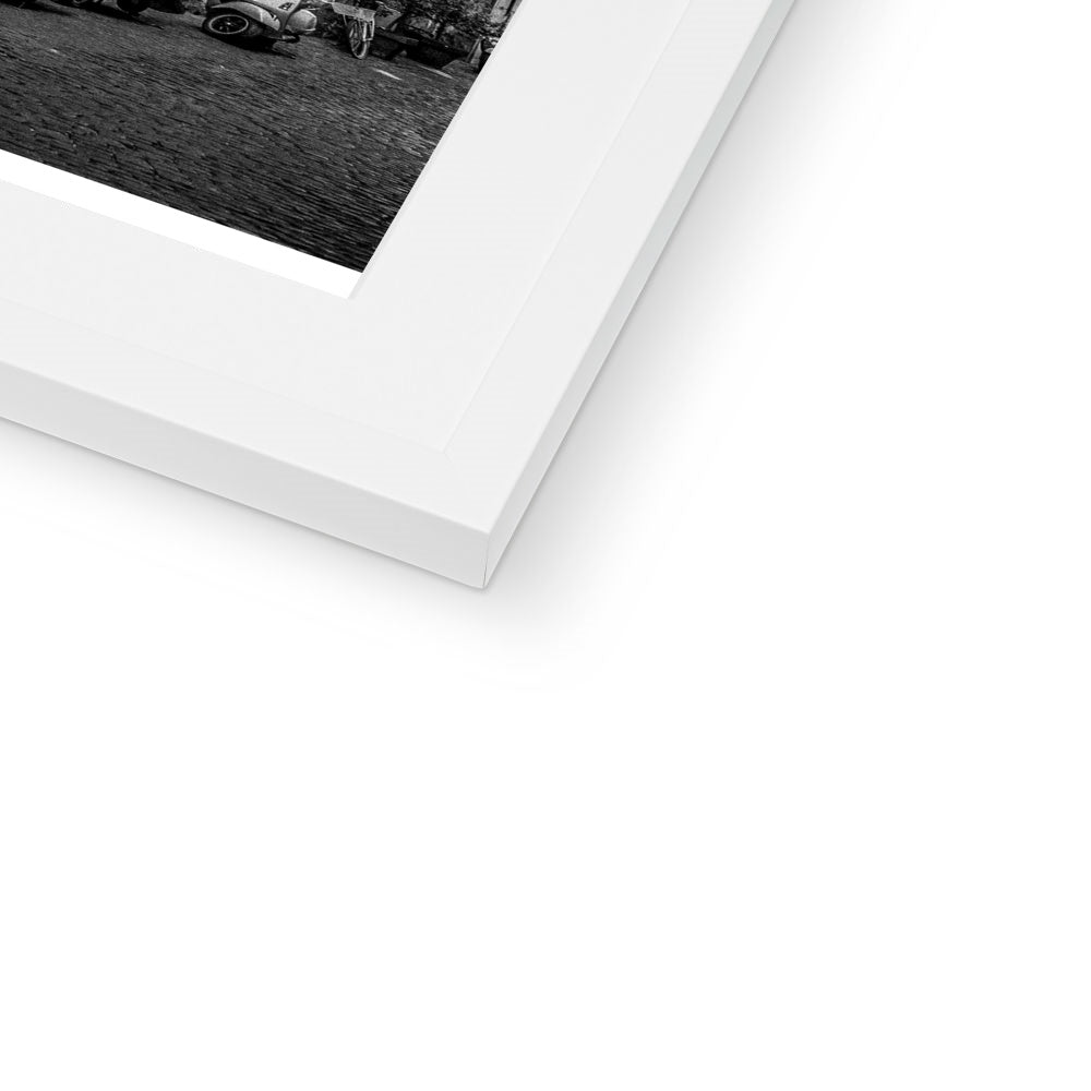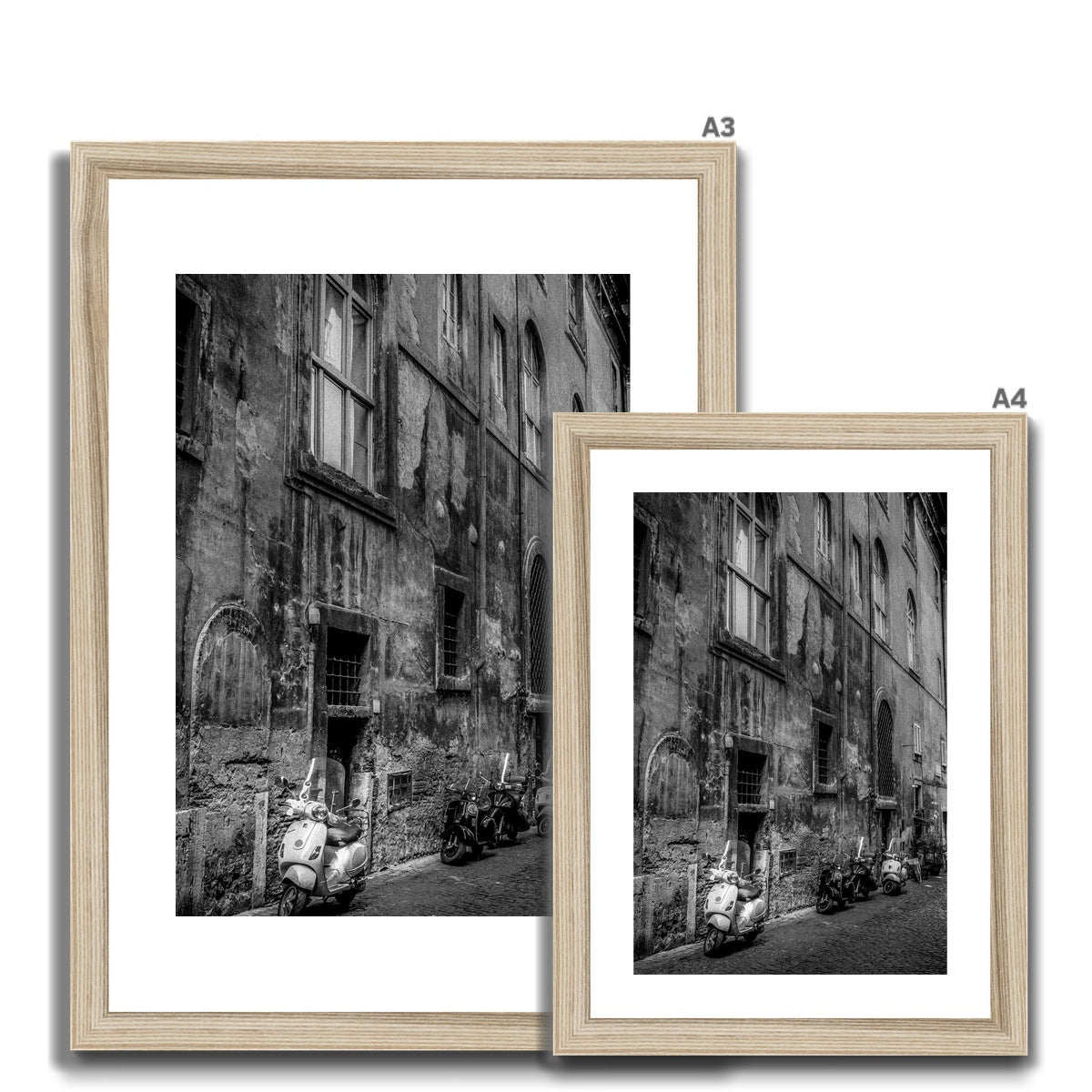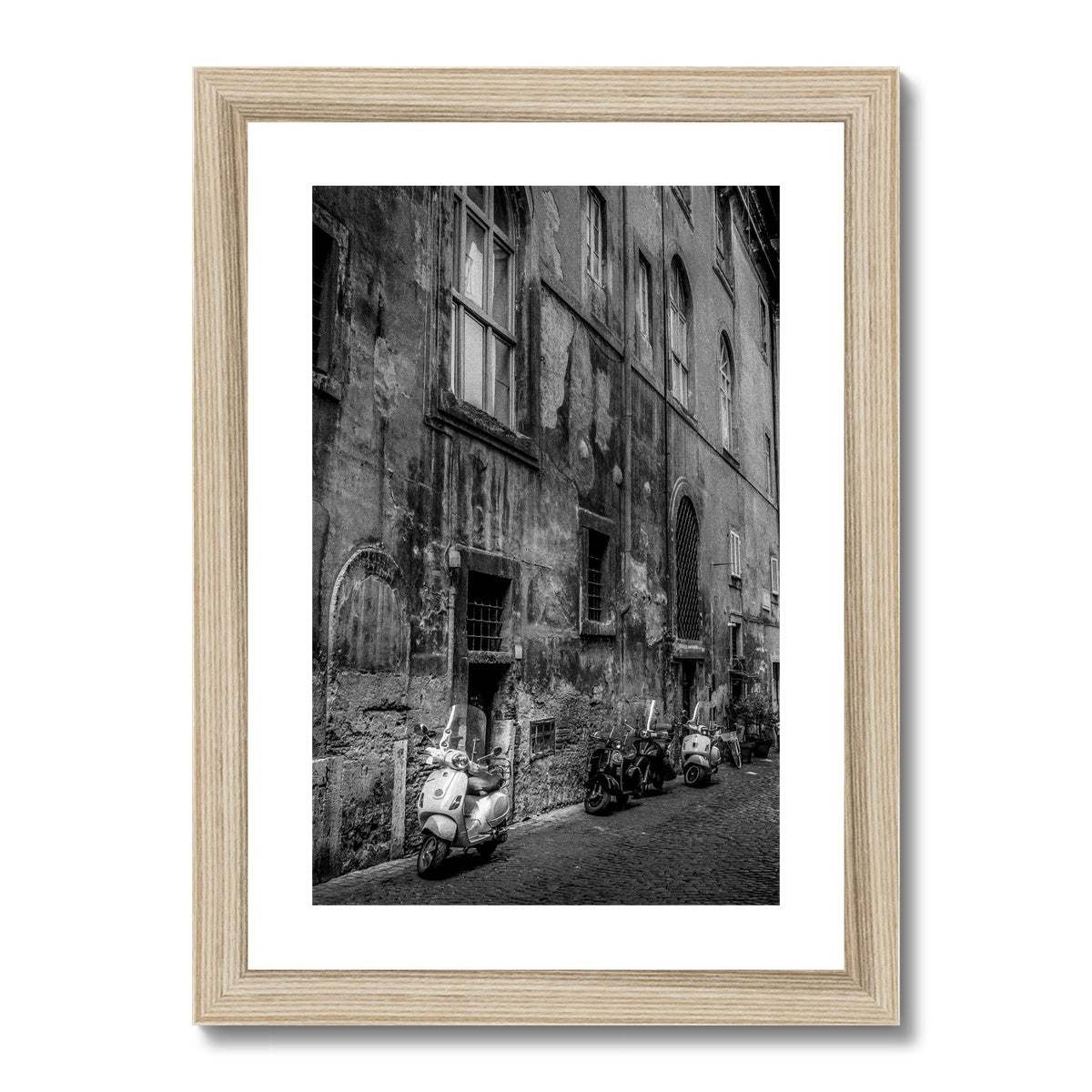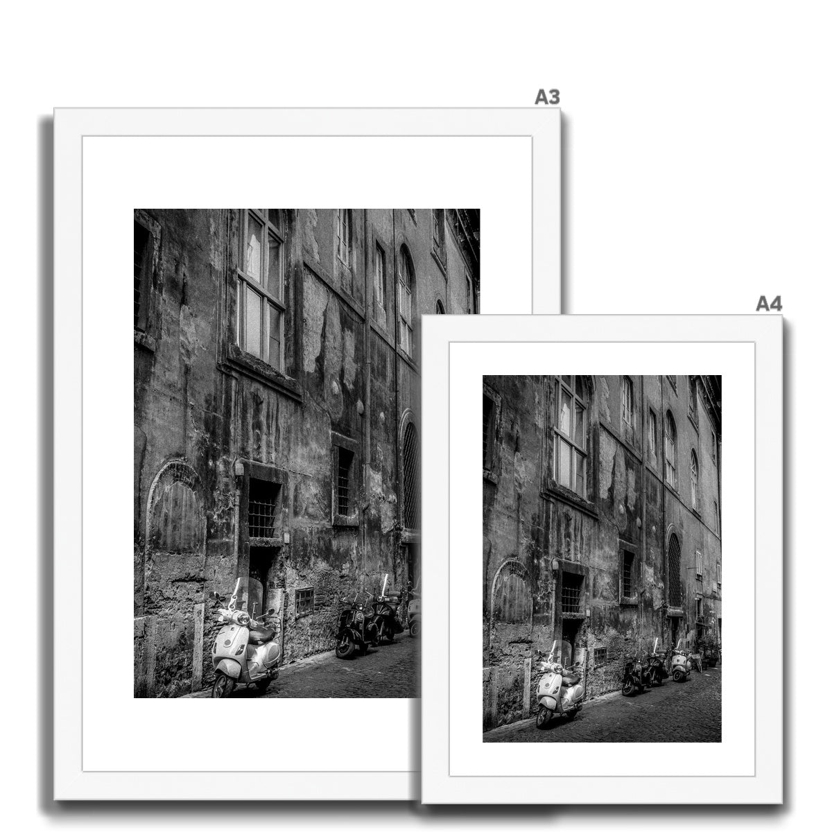Typical street with parked scooters in the centre of Rome. Italy. Framed & Mounted Print