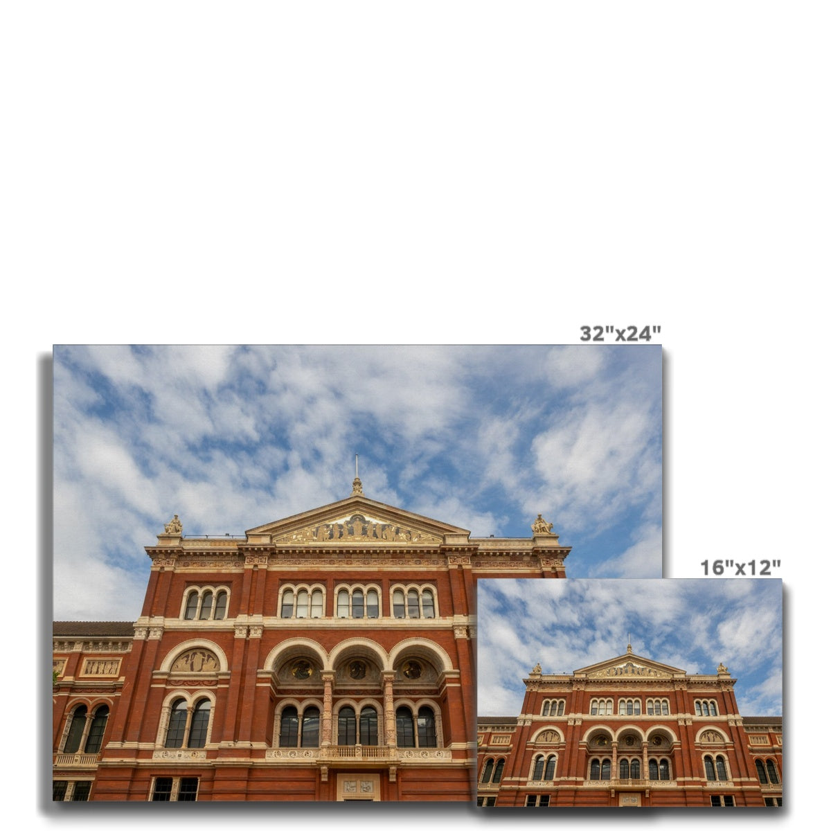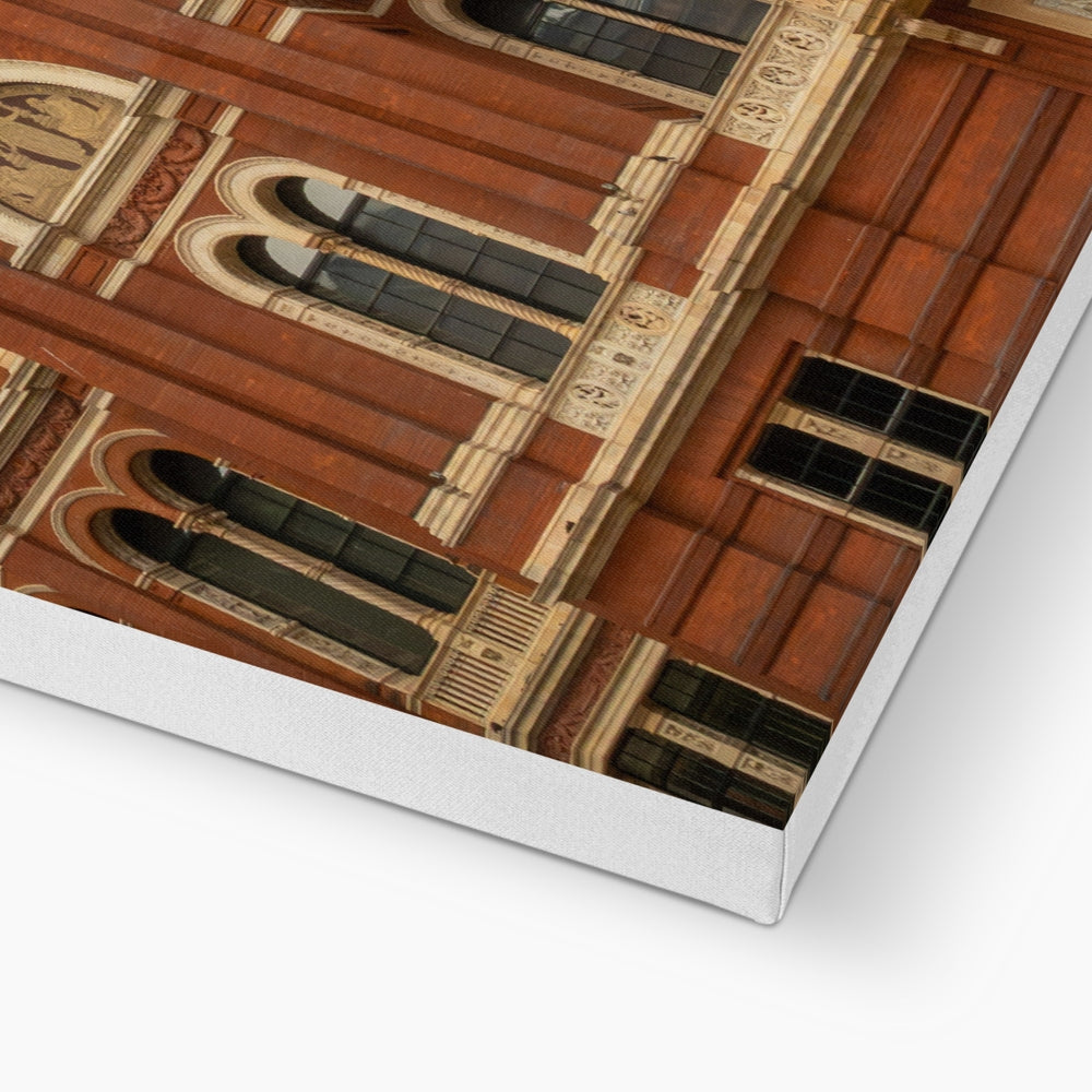 Victorian red-brick rear façade of the V&A Museum in London, with decorative arches and a gilded pediment. Canvas