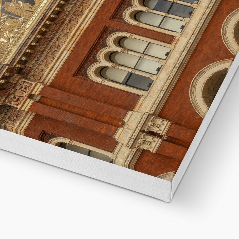 Victorian red-brick rear façade of the V&A Museum in London, with decorative arches and a gilded pediment. Canvas