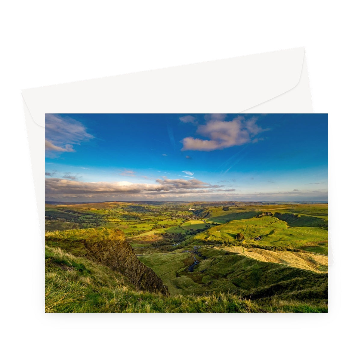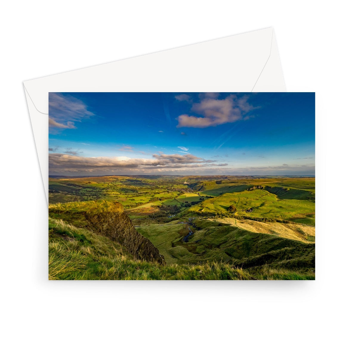View from summit of Mam Tor Castleton and Hope Valley, Peak District, UK. Greeting Card