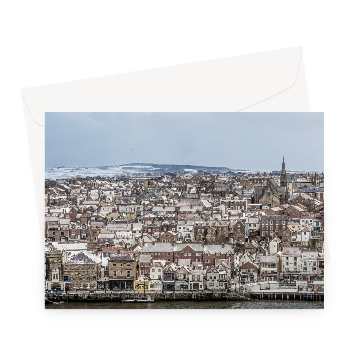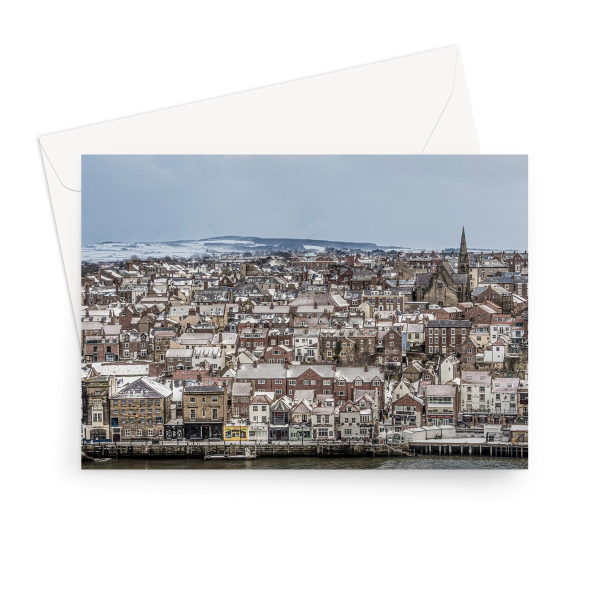 View of Whitby town centre in snow from St Mary's Church, Whitby, UK. Greeting Card