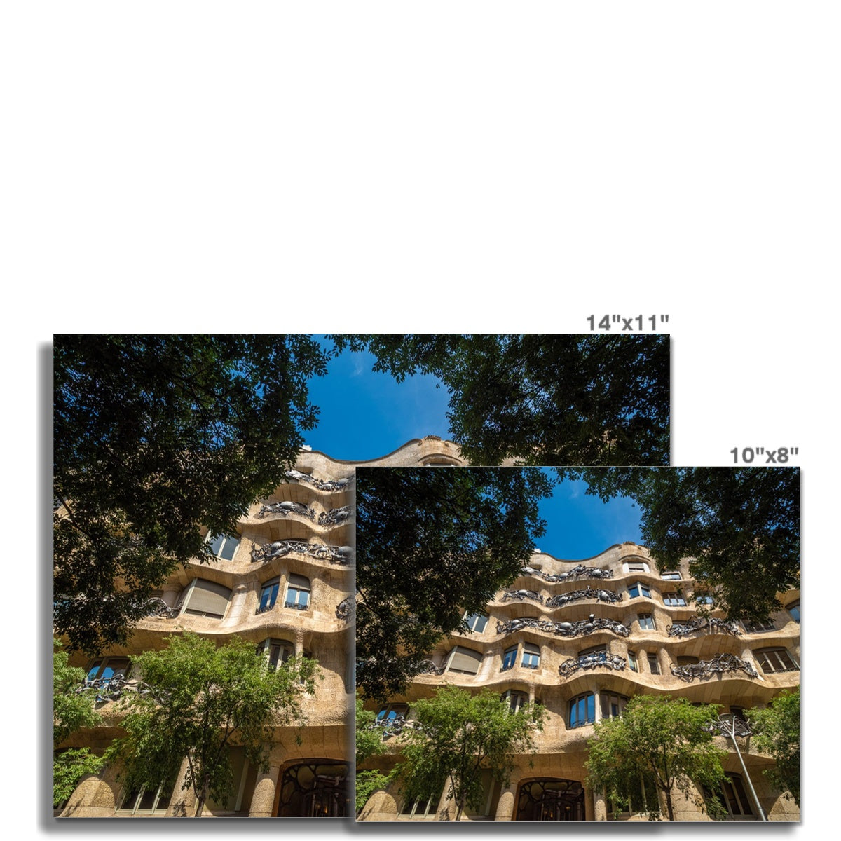 Wavy stone facade and wrought iron balconies of Gaudí’s Casa Milà in Barcelona, framed by green trees Fine Art Print