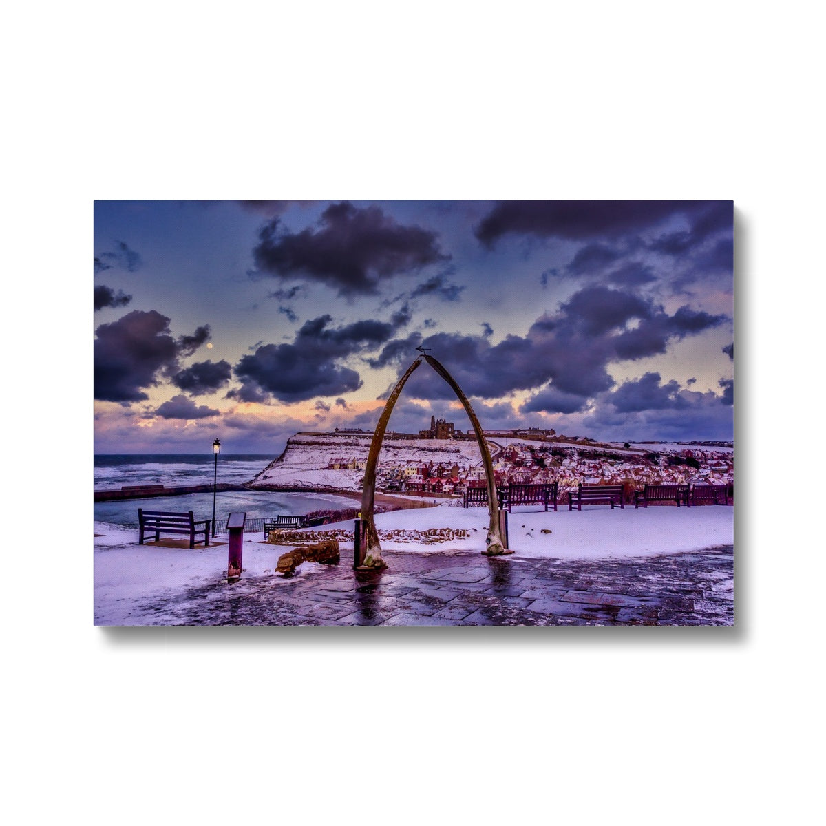Whalebone Arch and view of Whitby Abbey in snow, Whitby, UK. Canvas