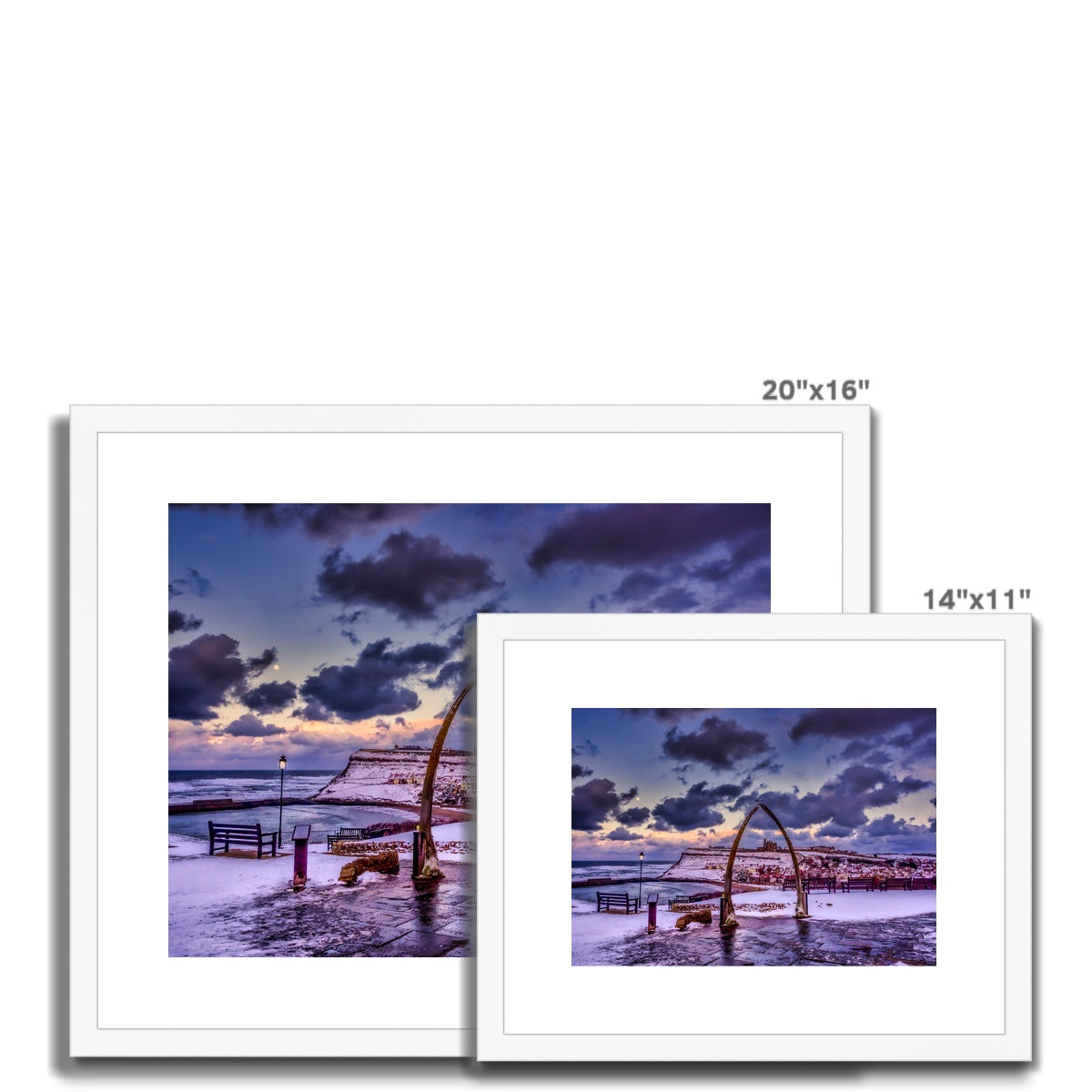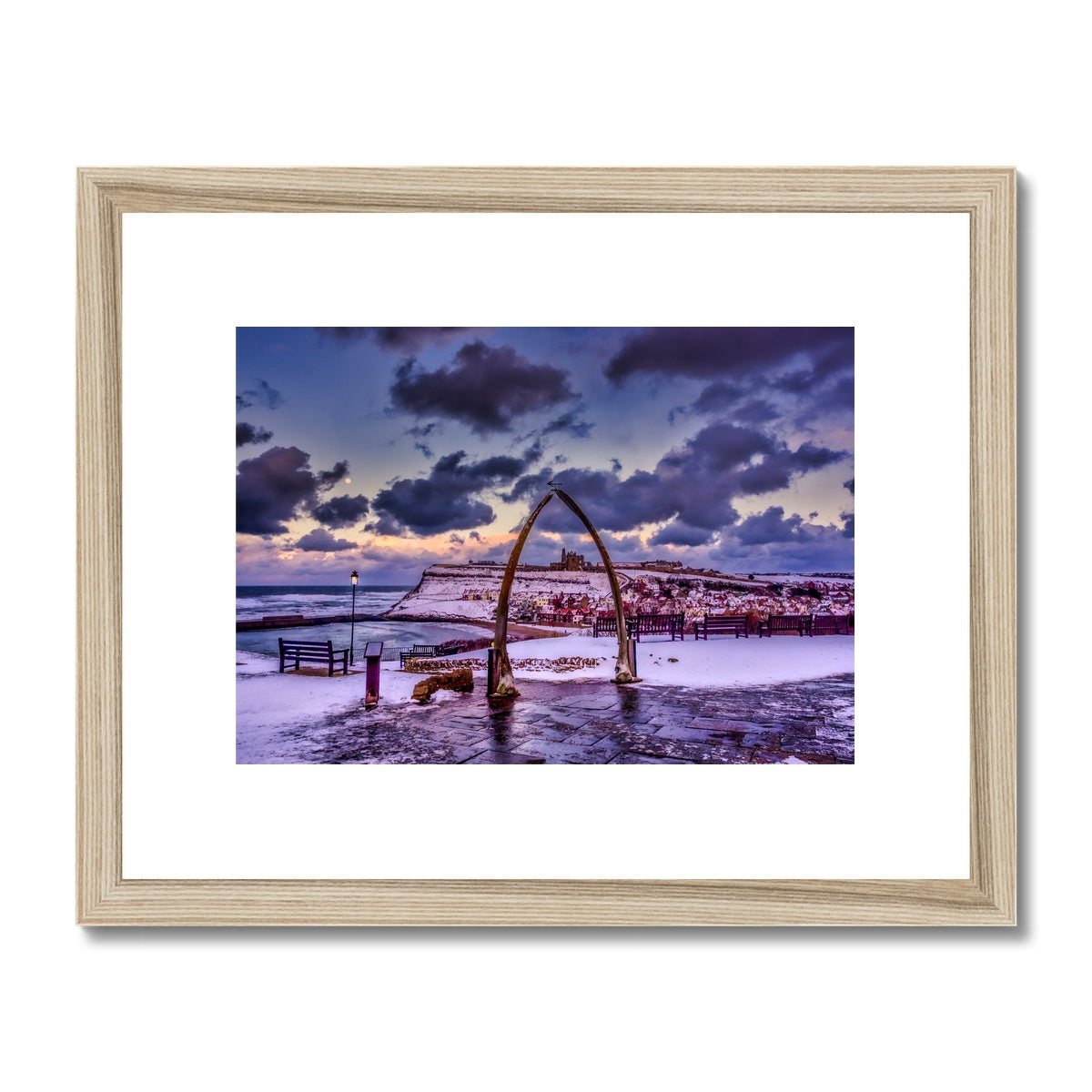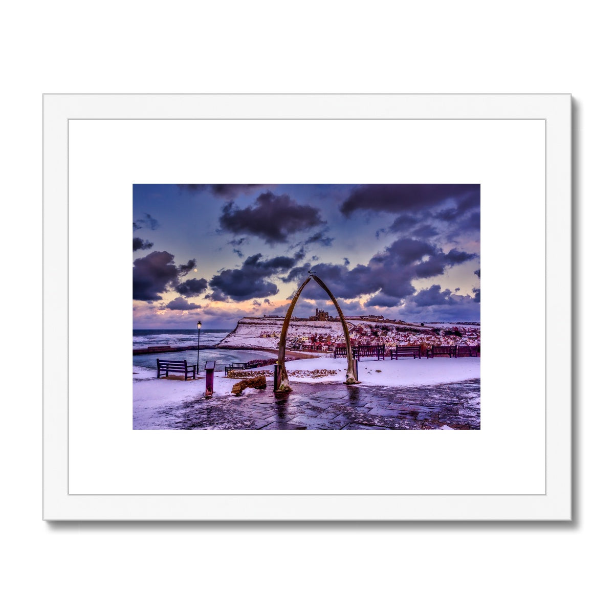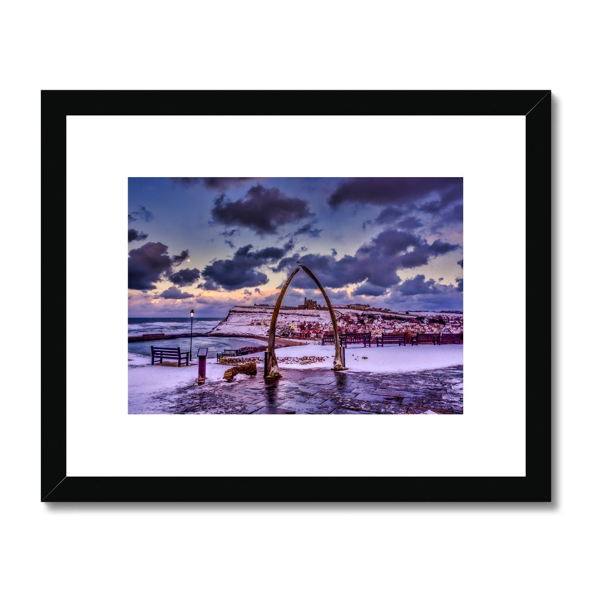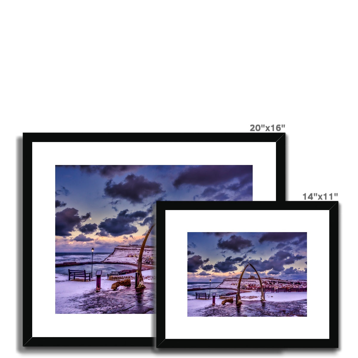 Whalebone Arch and view of Whitby Abbey in snow, Whitby, UK. Framed & Mounted Print