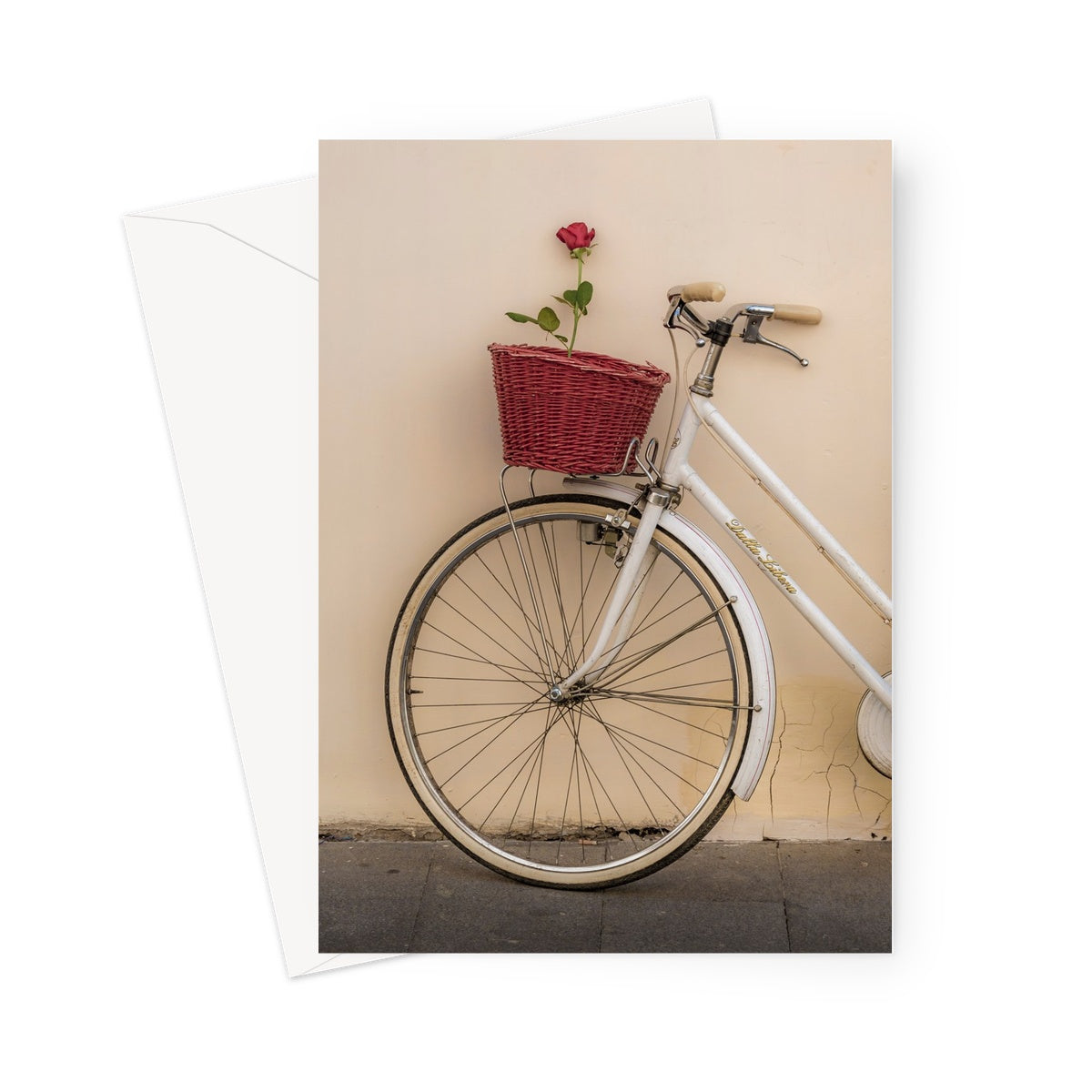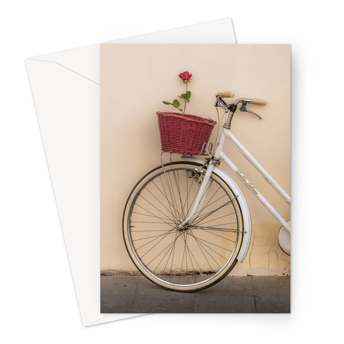 White bicycle parked against a rendered wall with a red rose in its basket, Rome, Italy. Greeting Card