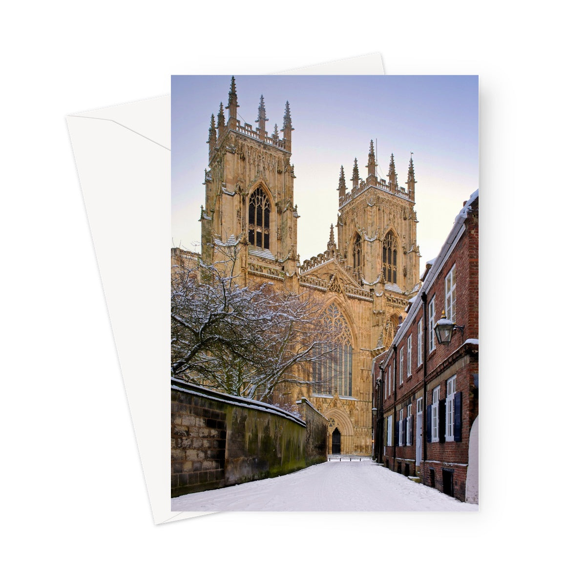 York Minster in the snow seen from Precentors Court. York, UK. Greeting Card